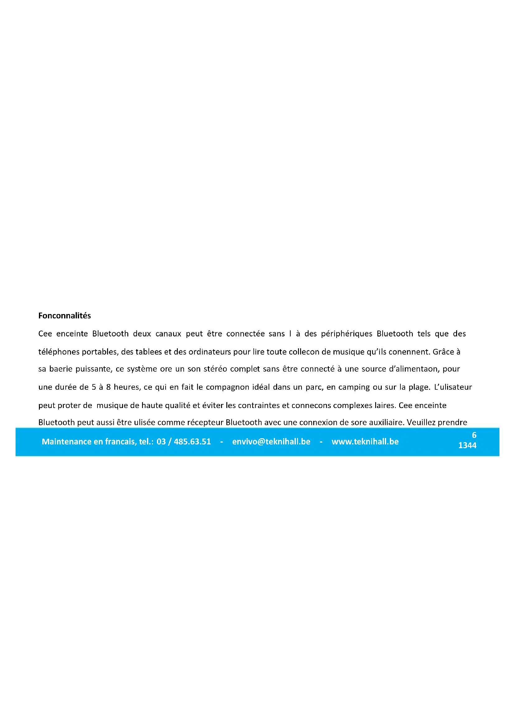 Maintenance en francais, tel.: 03 / 485.63.51 - envivo@teknihall.be - www.teknihall.be Fonctionnalités Cette enceinte Bluetooth deux canaux peut être connectée sans fil à des périphériques Bluetooth tels que des téléphones portables, des tablettes et des ordinateurs pour lire toute collection de musique qu’ils contiennent. Grâce à sa batterie puissante, ce système offre un son stéréo complet sans être connecté à une source d’alimentation, pour une durée de 5 à 8 heures, ce qui en fait le compagnon idéal dans un parc, en camping ou sur la plage. L’utilisateur peut profiter de musique de haute qualité et éviter les contraintes et connections complexes filaires. Cette enceinte Bluetooth peut aussi être utilisée comme récepteur Bluetooth avec une connexion de sortie auxiliaire. Veuillez prendre7