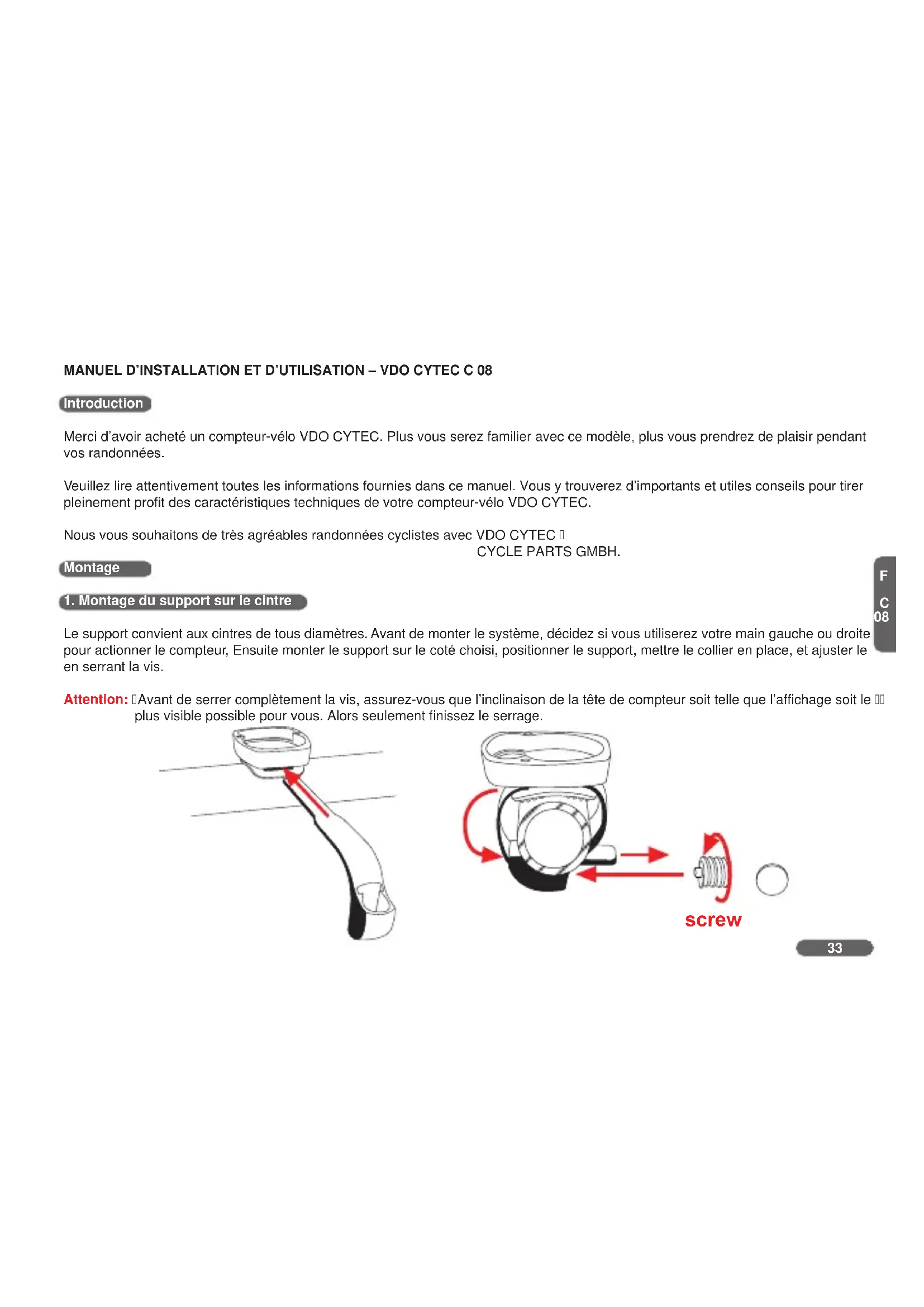 Le support convient aux cintres de tous diamètres. Avant de monter le système, décidez si vous utiliserez votre main gauche ou droite pour actionner le compteur, Ensuite monter le support sur le coté choisi, positionner le support, mettre le collier en place, et ajuster le en serrant la vis. Attention: Avant de serrer complètement la vis, assurez-vous que l’inclinaison de la tête de compteur soit telle que l’affichage soit le plus visible possible pour vous. Alors seulement finissez le serrage. MANUEL D’INSTALLATION ET D’UTILISATION – VDO CYTEC C 08 Introduction Merci d’avoir acheté un compteur-vélo VDO CYTEC. Plus vous serez familier avec ce modèle, plus vous prendrez de plaisir pendant vos randonnées. Veuillez lire attentivement toutes les informations fournies dans ce manuel. Vous y trouverez d’importants et utiles conseils pour tirer pleinement profit des caractéristiques techniques de votre compteur-vélo VDO CYTEC. Nous vous souhaitons de très agréables randonnées cyclistes avec VDO CYTEC CYCLE PARTS GMBH. Montage