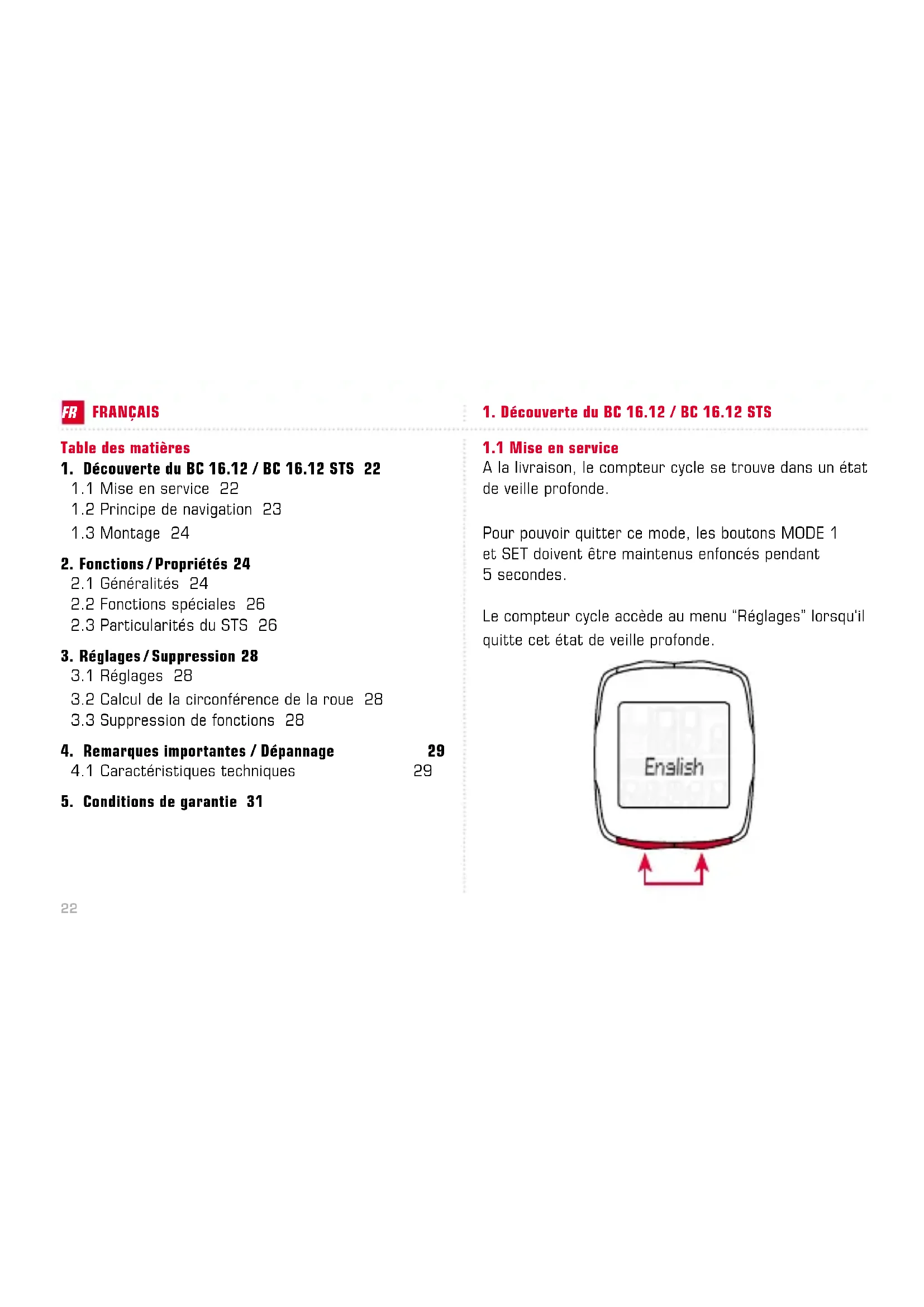 A la livraison, le compteur cycle se trouve dans un état de veille profonde. Pour pouvoir quitter ce mode, les boutons MODE 1 et SET doivent être maintenus enfoncés pendant 5 secondes. Le compteur cycle accède au menu “Réglages” lorsqu‘il quitte cet état de veille profonde.