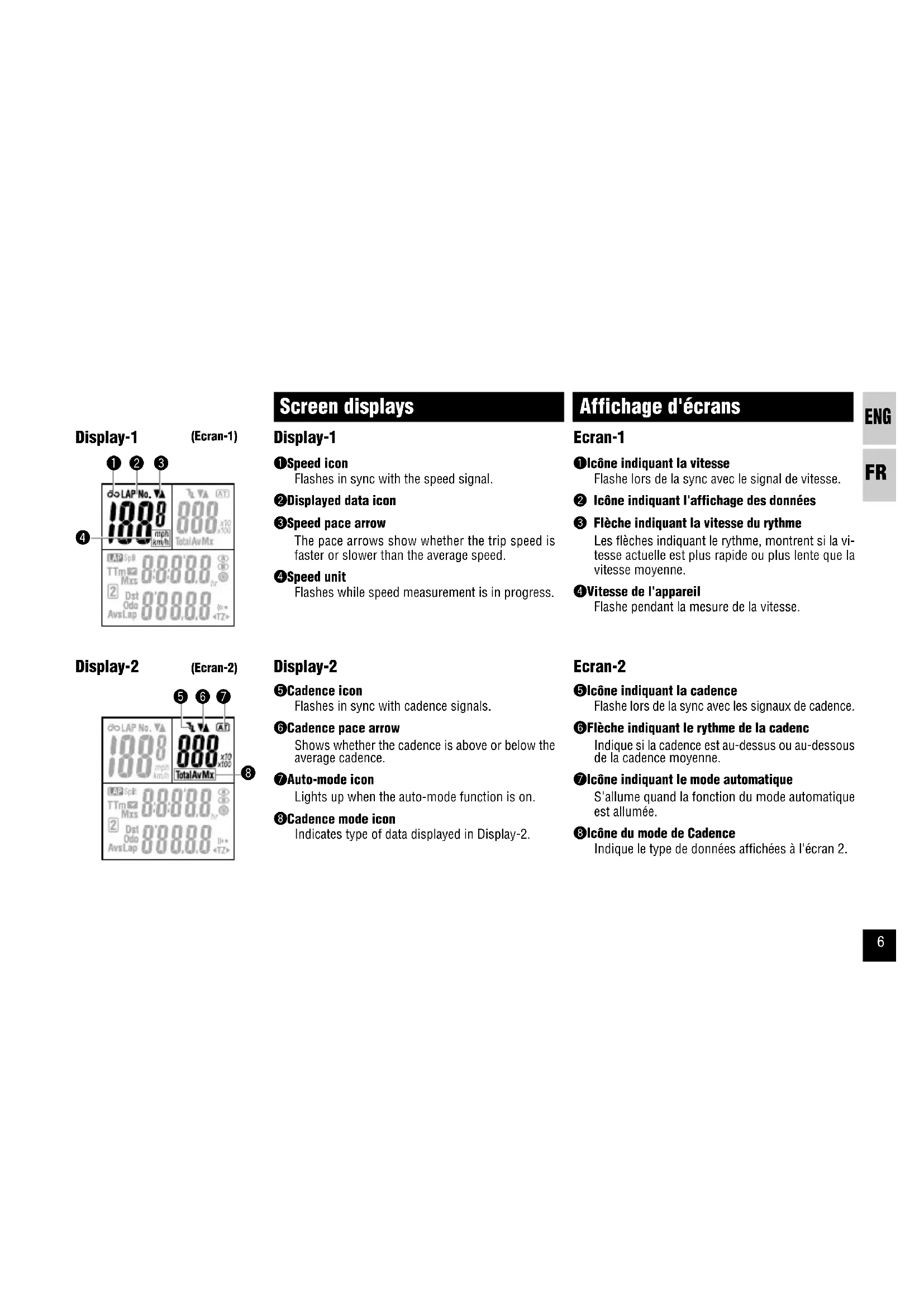 | Display-2 Cadence 0(30) - 299 rpmAverage cadence 0 - 299 rpmMaximum cadence 0(30) - 299 rpmPedal count 0 - 99900 rotationsAverage lap cadence 0 - 299 rpm (For the lap indication mode) | |
