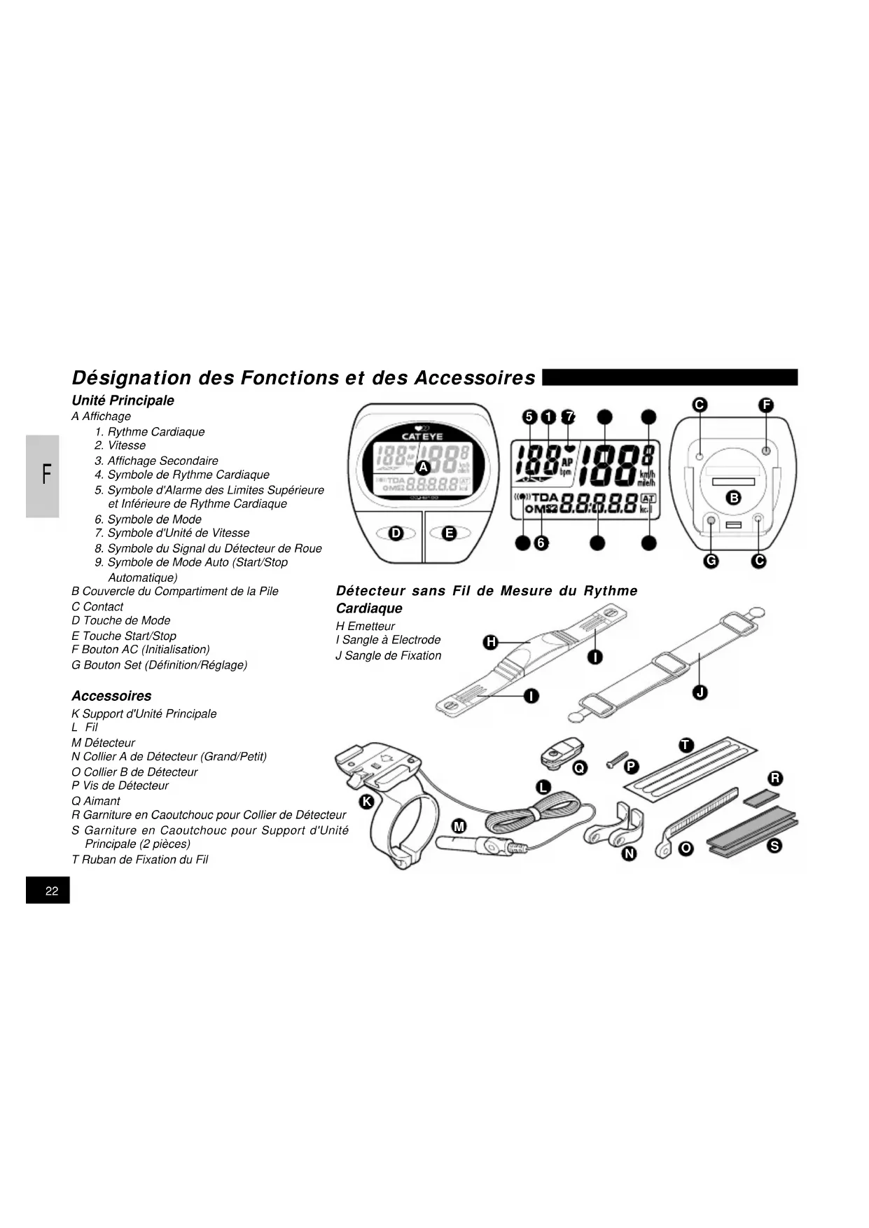 Désignation des Fonctions et des Accessoires Unité Principale A Affichage1. Rythme Cardiaque2. Vitesse3. Affichage Secondaire4. Symbole de Rythme Cardiaque5. Symbole d'Alarme des Limites Supérieureet Inférieure de Rythme Cardiaque6. Symbole de Mode7. Symbole d'Unité de Vitesse8. Symbole du Signal du Détecteur de Roue9. Symbole de Mode Auto (Start/StopAutomatique)B Couvercle du Compartiment de la PileC ContactD Touche de ModeE Touche Start/StopF Bouton AC (Initialisation)G Bouton Set (Définition/Réglage) Détecteur sans Fil de Mesure du Rythme Cardiaque H EmetteurI Sangle à ElectrodeJ Sangle de Fixation Accessoires K Support d'Unité Principale LFil M DétecteurN Collier A de Détecteur (Grand/Petit)O Collier B de DétecteurP Vis de DétecteurQ AimantR Garniture en Caoutchouc pour Collier de DétecteurS Garniture en Caoutchouc pour Support d'UnitéPrincipale (2 pièces)T Ruban de Fixation du FilF
