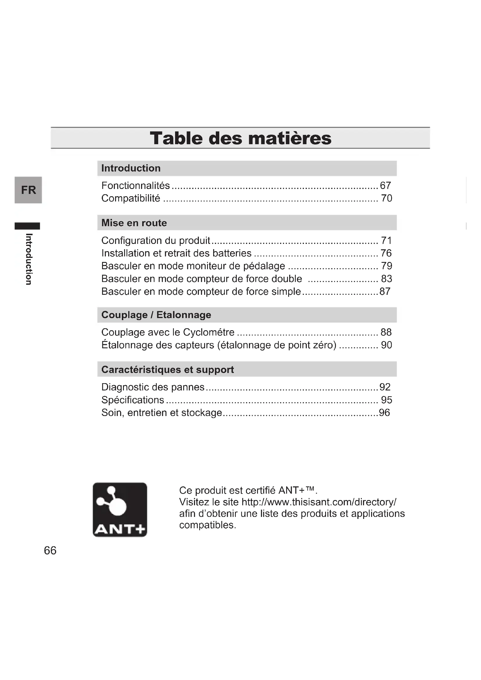 - Soin, entretien et stockage Introduction Ce produit est certié ANT+™. Visitez le site http://www.thisisant.com/directory/ an d’obtenir une liste des produits et applications compatibles.67 p. 96