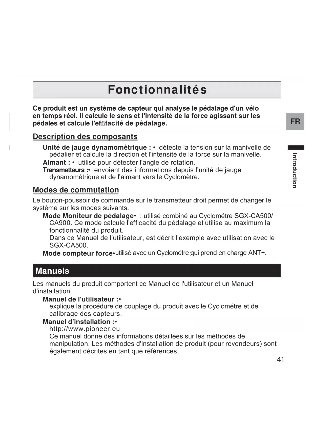 Introduction Fonctionnalités Ce produit est un système de capteur qui analyse le pédalage d'un vélo en temps réel. Il calcule le sens et l'intensité de la force agissant sur les pédales et calcule l'effifacité de pédalage. Description des composants Unité de jauge dynamomètrique : • détecte la tension sur la manivelle de pédalier et calcule la direction et l'intensité de la force sur la manivelle. Aimant : • utilisé pour détecter l'angle de rotation. Transmetteurs :• envoient des informations depuis l’unité de jauge dynamométrique et de l’aimant vers le Cyclomètre. Modes de commutation Le bouton-poussoir de commande sur le transmetteur droit permet de changer le système sur les modes suivants. Mode Moniteur de pédalage• : utilisé combiné au Cyclométre SGX-CA500/ CA900. Ce mode calcule l'efficacité du pédalage et utilise au maximum la fonctionnalité du produit. Dans ce Manuel de l’utilisateur, est décrit l’exemple avec utilisation avec le SGX-CA500. Mode compteur force• : utilisé avec un Cyclométre qui prend en charge ANT+. Manuels Les manuels du produit comportent ce Manuel de l'utilisateur et un Manuel d'installation. Manuel de l'utilisateur :• explique la procédure de couplage du produit avec le Cyclométre et de calibrage des capteurs. Manuel d'installation :• http://www.pioneer.eu Ce manuel donne des informations détaillées sur les méthodes de manipulation. Les méthodes d'installation de produit (pour revendeurs) sont également décrites en tant que références.42