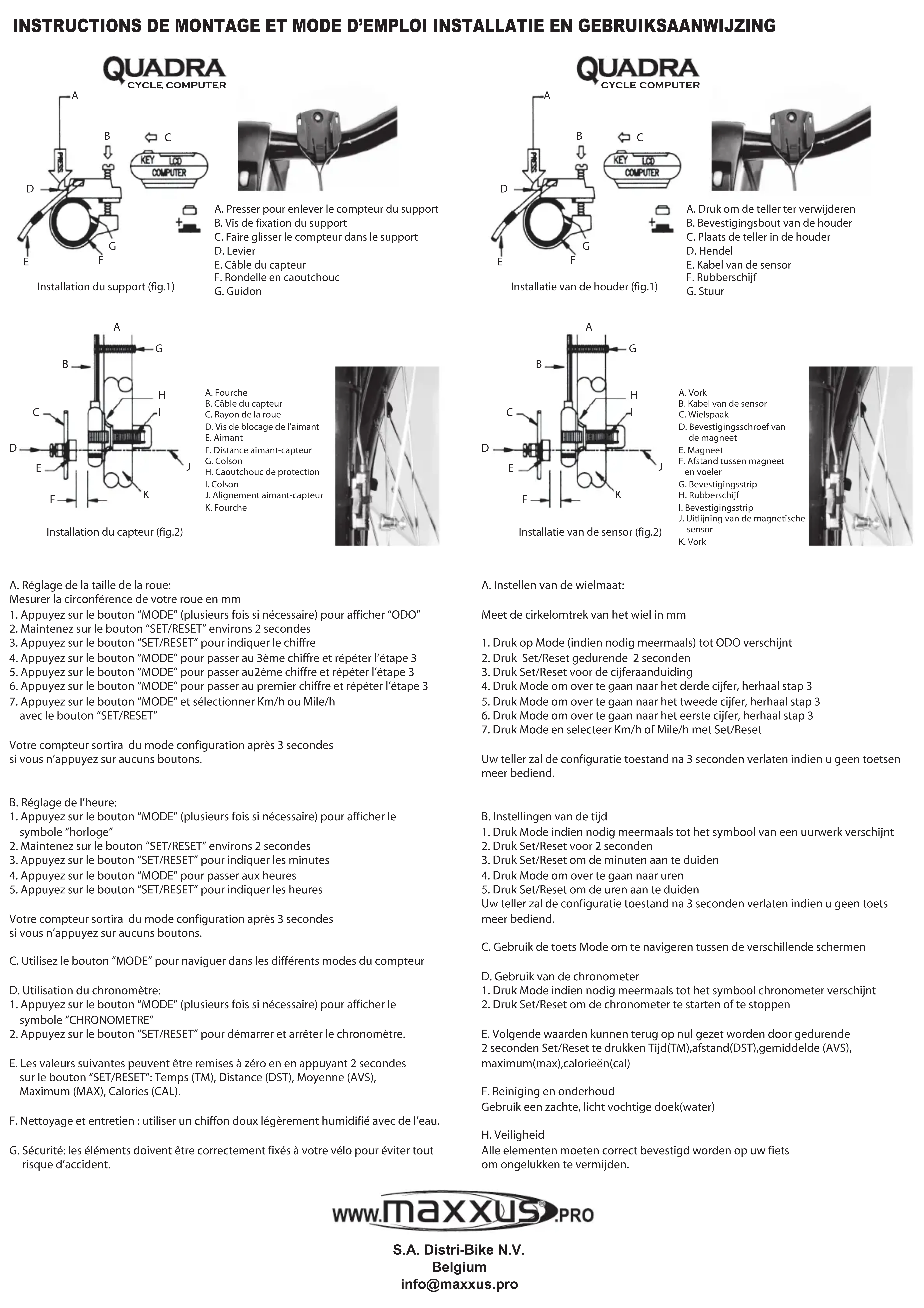 E. Les valeurs suivantes peuvent être remises à zéro en en appuyant 2 secondes sur le bouton “SET/RESET”: Temps (TM), Distance (DST), Moyenne (AVS), Maximum (MAX), Calories (CAL). F. Nettoyage et entretien : utiliser un chiffon doux légèrement humidifié avec de l’eau. G. Sécurité: les éléments doivent être correctement fixés à votre vélo pour éviter tout risque d’accident. INSTRUCTIONS DE MONTAGE ET MODE D’EMPLOI INSTALLATIE EN GEBRUIKSAANWIJZING