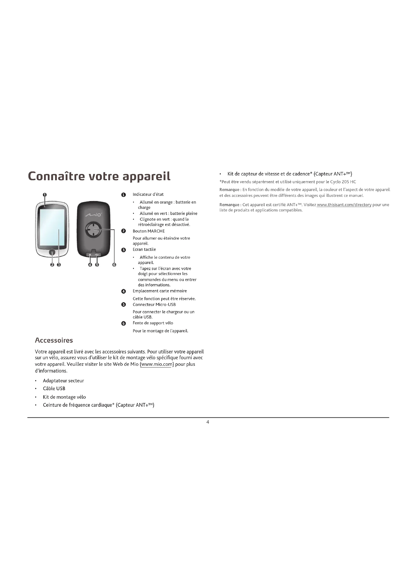 - 200/205 Manuel d’utilisation2 Bienvenue Merci d’avoir acheté cet appareil. Veuillez lire attentivement ce manuel avant d’utiliser votre appareil pour la première fois. Conservez ce manuel en lieu sûr et utilisez-le comme référence prioritaire. Informations importantes relatives à l’utilisation de ce manuel Il est important de comprendre les termes et les conventions typographiques utilisés dans ce manuel. Caractère gras — Composants ou items qui s’affichent à l’écran, y compris les boutons, les en-têtes, les noms de champ et les options. Caractère italique — Indique le nom d’un écran. Décharge de responsabilité Tous les modèles ne sont pas disponibles dans toutes les régions. Selon le modèle acheté, la couleur et l’apparence de votre appareil et des accessoires peuvent ne pas être exactement tel que montré dans les différentes images de ce document. Mio applique une politique de développement en continu. Mio se réserve le droit d’effectuer des modifications et des améliorations sur les produits décrits dans ce document, sans préavis. Mio ne garantit pas l’absence d’erreur dans ce document. Les captures d’écran et les autres présentations qui illustrent ce manuel, peuvent être différentes des écrans et présentations réels du produit actuel. Ces différences sont mineures et le produit actuel présente la fonctionnalité matérielle décrite dans ce Manuel de l’utilisateur. Copyright © 2016 MiTAC International Corporation. Mio est une marque déposée de MiTAC International Corporation. Tous droits réservés. Toutes les marques ou les noms de produit sont des marques déposées ou des marques commerciales de leurs sociétés respectives. ANT+™ est une marque commerciale de Dynastream Innovations Inc. ou de ses filiales. Révision : R00 (6/2016) Table des matières Bienvenue p. 2