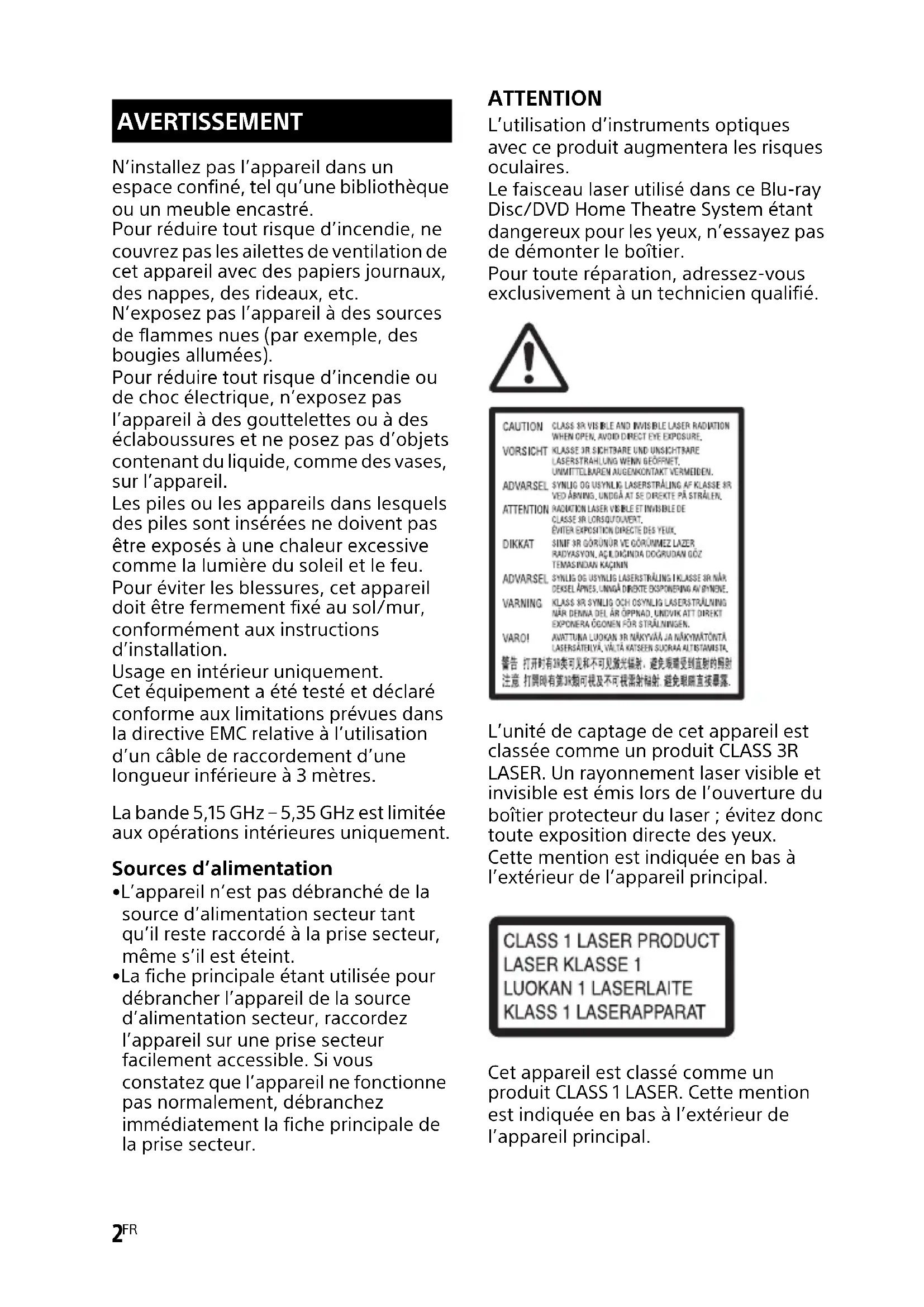 - La fiche principale étant utilisée pour débrancher l’appareil de la source d’alimentation secteur, raccordez l’appareil sur une prise secteur facilement accessible. Si vous constatez que l’appareil ne fonctionne pas normalement, débranchez immédiatement la fiche principale de la prise secteur. ATTENTION L’utilisation d’instruments optiques avec ce produit augmentera les risques oculaires. Le faisceau laser utilisé dans ce Blu-ray Disc/DVD Home Theatre System étant dangereux pour les yeux, n’essayez pas de démonter le boîtier. Pour toute réparation, adressez-vous exclusivement à un technicien qualifié. L’unité de captage de cet appareil est classée comme un produit CLASS 3R LASER. Un rayonnement laser visible et invisible est émis lors de l’ouverture du boîtier protecteur du laser ; évitez donc toute exposition directe des yeux. Cette mention est indiquée en bas à l’extérieur de l’appareil principal. Cet appareil est classé comme un produit CLASS 1 LASER. Cette mention est indiquée en bas à l’extérieur de l’appareil principal. AVERTISSEMENTD:\NORM'S JOB\SONY HA\SO160050\BDV-N9200_7200_5200_Ref (PMRF 05)\4485833161_GBFRESDENLITPL (CEK)\FR\020REG.fm masterpage: Right