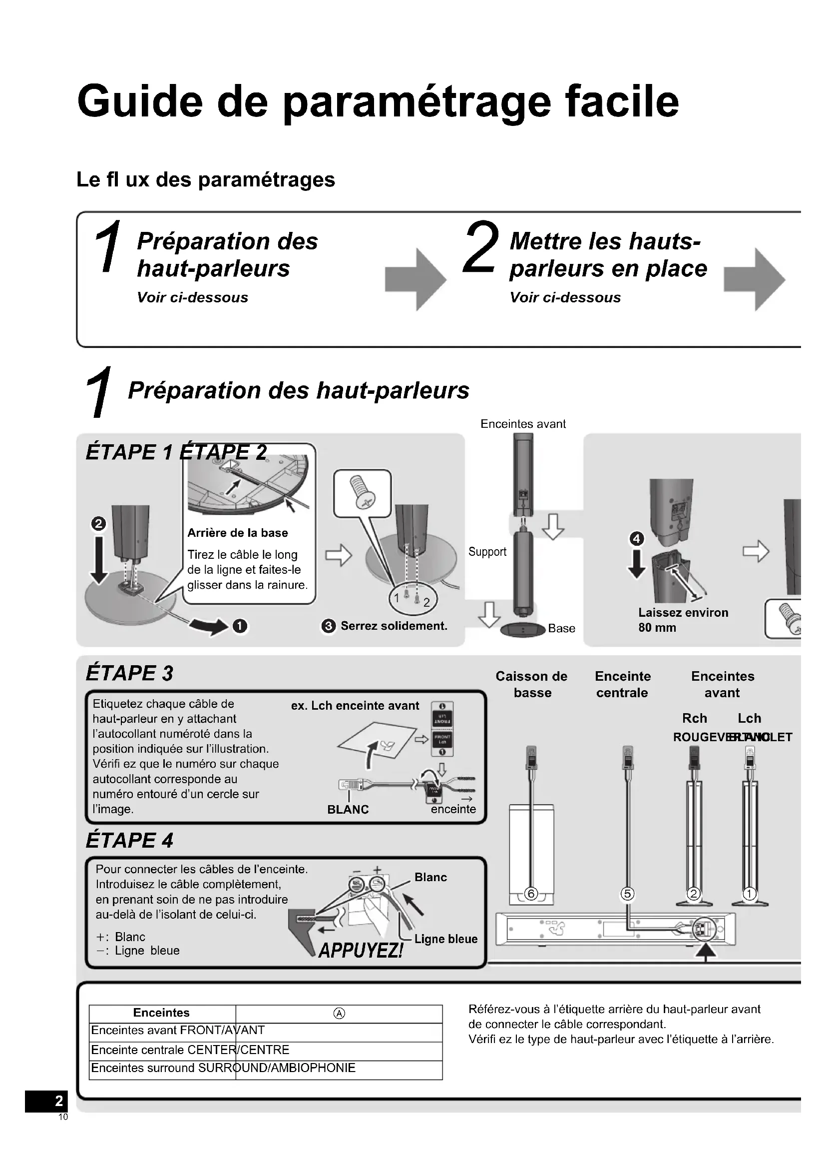 Guide de paramétrage facile Le fl ux des paramétrages Préparation des haut-parleurs Voir ci-dessous Mettre les hauts- parleurs en place Voir ci-dessous Préparation des haut-parleurs Référez-vous à l’étiquette arrière du haut-parleur avant de connecter le câble correspondant.Vérifi ez le type de haut-parleur avec l’étiquette à l’arrière.Enceintes Enceintes avant FRONT/AVANTEnceinte centrale CENTER/CENTREEnceintes surround SURROUND/AMBIOPHONIEEtiquetez chaque câble de haut-parleur en y attachant l’autocollant numéroté dans la position indiquée sur l’illustration. Vérifi ez que le numéro sur chaque autocollant corresponde au numéro entouré d’un cercle sur l’image.Pour connecter les câbles de l’enceinte.Introduisez le câble complètement, en prenant soin de ne pas introduire au-delà de l’isolant de celui-ci.: Blanc: Ligne bleueex. Lch enceinte avant APPUYEZ! Enceintes avant Enceinte centrale Caisson de basse ÉTAPE 3 ÉTAPE 4 ÉTAPE 1 ÉTAPE 2 BLANCBlancLigne bleueSerrez solidement.Laissez environ 80 mmEnceintes avantSupport Base enceinte Lch BLANC Rch ROUGEVERTVIOLETArrière de la baseTirez le câble le long de la ligne et faites-le glisser dans la rainure. SCBTT770EG-VQC8274.indb10SCBTT770EG-VQC8274.indb10 2011/01/1411:25:112011/01/1411:25:1111