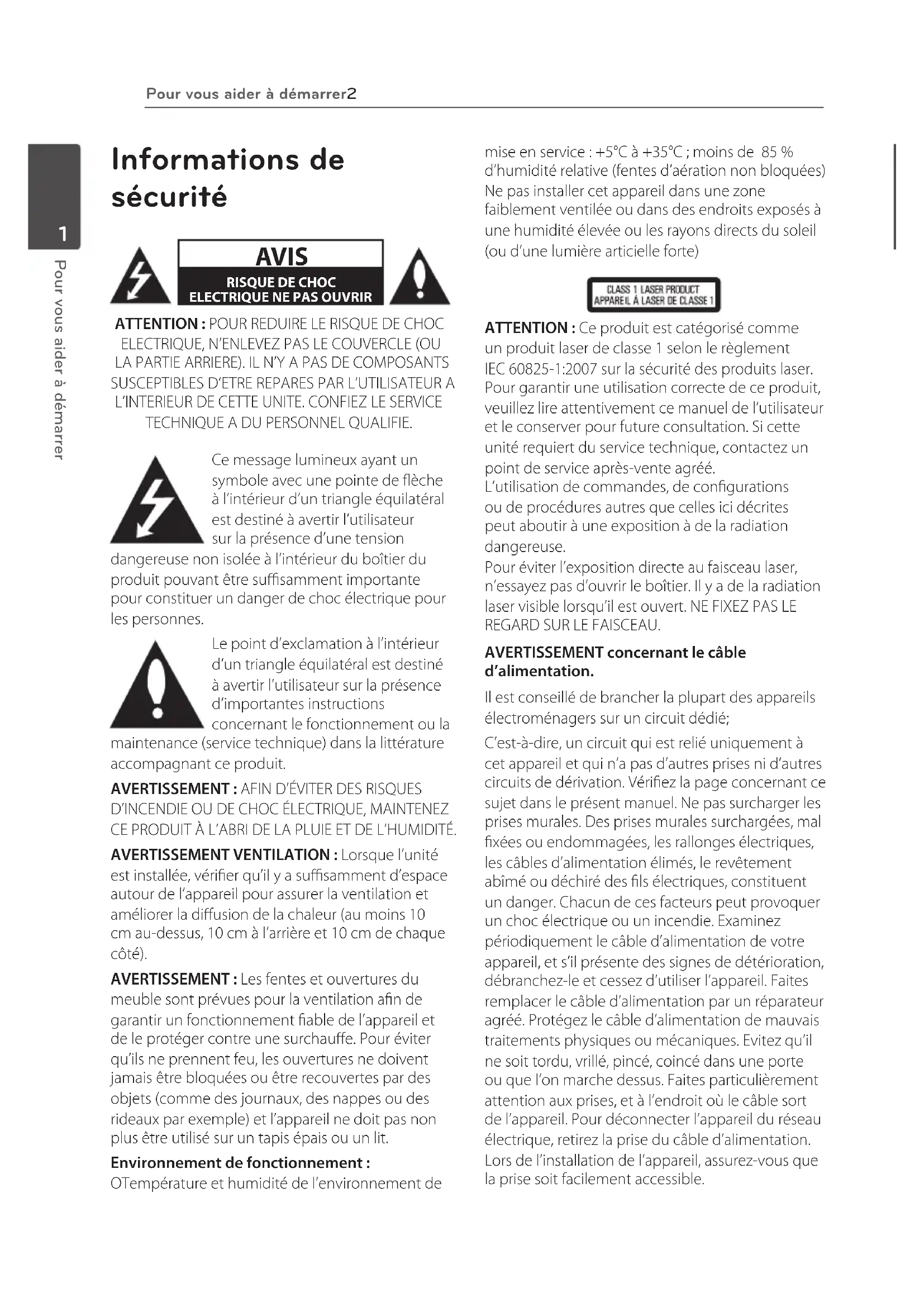 meuble sont prévues pour la ventilation an de garantir un fonctionnement able de l’appareil et de le protéger contre une surchaue. Pour éviter qu’ils ne prennent feu, les ouvertures ne doivent jamais être bloquées ou être recouvertes par des objets (comme des journaux, des nappes ou des rideaux par exemple) et l’appareil ne doit pas non plus être utilisé sur un tapis épais ou un lit. Environnement de fonctionnement : OTempérature et humidité de l’environnement de mise en service : +5°C à +35°C ; moins de 85 % d’humidité relative (fentes d’aération non bloquées) Ne pas installer cet appareil dans une zone faiblement ventilée ou dans des endroits exposés à une humidité élevée ou les rayons directs du soleil (ou d’une lumière articielle forte) ATTENTION : Ce produit est catégorisé comme un produit laser de classe 1 selon le règlement IEC 60825-1:2007 sur la sécurité des produits laser. Pour garantir une utilisation correcte de ce produit, veuillez lire attentivement ce manuel de l’utilisateur et le conserver pour future consultation. Si cette unité requiert du service technique, contactez un point de service après-vente agréé. L’utilisation de commandes, de congurations ou de procédures autres que celles ici décrites peut aboutir à une exposition à de la radiation dangereuse. Pour éviter l’exposition directe au faisceau laser, n’essayez pas d’ouvrir le boîtier. Il y a de la radiation laser visible lorsqu’il est ouvert. NE FIXEZ PAS LE REGARD SUR LE FAISCEAU. AVERTISSEMENT concernant le câble d’alimentation. Il est conseillé de brancher la plupart des appareils électroménagers sur un circuit dédié; C’est-à-dire, un circuit qui est relié uniquement à cet appareil et qui n’a pas d’autres prises ni d’autres circuits de dérivation. Vériez la page concernant ce sujet dans le présent manuel. Ne pas surcharger les prises murales. Des prises murales surchargées, mal xées ou endommagées, les rallonges électriques, les câbles d’alimentation élimés, le revêtement abîmé ou déchiré des ls électriques, constituent un danger. Chacun de ces facteurs peut provoquer un choc électrique ou un incendie. Examinez périodiquement le câble d’alimentation de votre appareil, et s’il présente des signes de détérioration, débranchez-le et cessez d’utiliser l’appareil. Faites remplacer le câble d’alimentation par un réparateur agréé. Protégez le câble d’alimentation de mauvais traitements physiques ou mécaniques. Evitez qu’il ne soit tordu, vrillé, pincé, coincé dans une porte ou que l’on marche dessus. Faites particulièrement attention aux prises, et à l’endroit où le câble sort de l’appareil. Pour déconnecter l’appareil du réseau électrique, retirez la prise du câble d’alimentation. Lors de l’installation de l’appareil, assurez-vous que la prise soit facilement accessible. HB916-MD0_BUSAPPK_FRE.indd 2 2011-09-23 9:05:01Pour vous aider à démarrer 3 Pour vous aider à démarrer