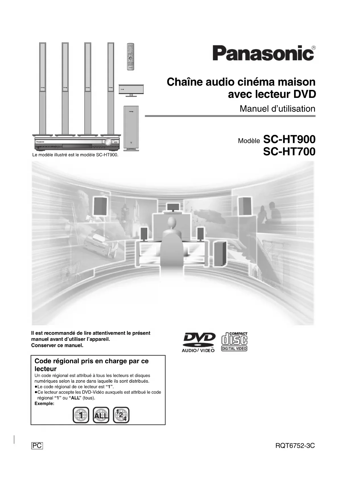 Le modèle illustré est le modèle SC-HT900. Il est recommandé de lire attentivement le présent manuel avant d’utiliser l’appareil. Conserver ce manuel. Code régional pris en charge par ce lecteur Un code régional est attribué à tous les lecteurs et disques numériques selon la zone dans laquelle ils sont distribués. ≥Le code régional de ce lecteur est “1”. ≥Ce lecteur accepte les DVD-Vidéo auxquels est attribué le code régional “1” ou “ALL” (tous). Exemple: 1 ALL
