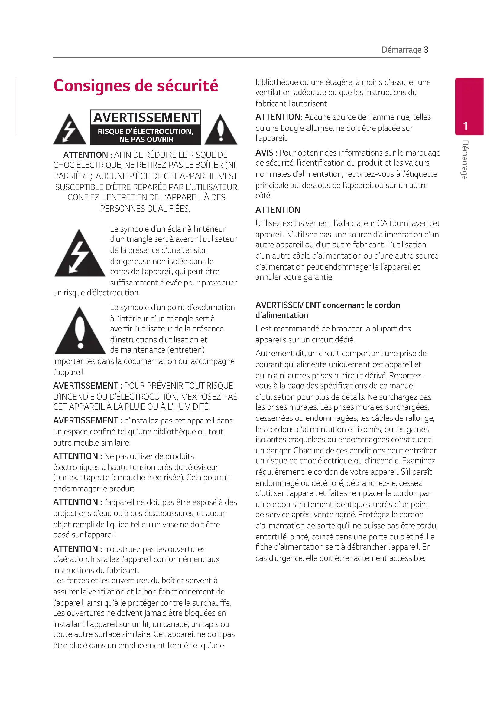 un espace conné tel qu’une bibliothèque ou tout autre meuble similaire. ATTENTION : Ne pas utiliser de produits électroniques à haute tension près du téléviseur (par ex. : tapette à mouche électrisée). Cela pourrait endommager le produit. ATTENTION : l’appareil ne doit pas être exposé à des projections d’eau ou à des éclaboussures, et aucun objet rempli de liquide tel qu’un vase ne doit être posé sur l’appareil. ATTENTION : n’obstruez pas les ouvertures d’aération. Installez l’appareil conformément aux instructions du fabricant. Les fentes et les ouvertures du boîtier servent à assurer la ventilation et le bon fonctionnement de l’appareil, ainsi qu’à le protéger contre la surchauffe. Les ouvertures ne doivent jamais être bloquées en installant l’appareil sur un lit, un canapé, un tapis ou toute autre surface similaire. Cet appareil ne doit pas être placé dans un emplacement fermé tel qu’une bibliothèque ou une étagère, à moins d’assurer une ventilation adéquate ou que les instructions du fabricant l’autorisent. ATTENTION: Aucune source de amme nue, telles qu’une bougie allumée, ne doit être placée sur l’appareil. AVIS : Pour obtenir des informations sur le marquage de sécurité, l’identification du produit et les valeurs nominales d’alimentation, reportez-vous à l’étiquette principale au-dessous de l’appareil ou sur un autre côté. ATTENTION Utilisez exclusivement l’adaptateur CA fourni avec cet appareil. N’utilisez pas une source d’alimentation d’un autre appareil ou d’un autre fabricant. L’utilisation d’un autre câble d’alimentation ou d’une autre source d’alimentation peut endommager le l’appareil et annuler votre garantie. AVERTISSEMENT concernant le cordon d’alimentation Il est recommandé de brancher la plupart des appareils sur un circuit dédié. Autrement dit, un circuit comportant une prise de courant qui alimente uniquement cet appareil et qui n’a ni autres prises ni circuit dérivé. Reportez- vous à la page des spécications de ce manuel d’utilisation pour plus de détails. Ne surchargez pas les prises murales. Les prises murales surchargées, desserrées ou endommagées, les câbles de rallonge, les cordons d’alimentation eflochés, ou les gaines isolantes craquelées ou endommagées constituent un danger. Chacune de ces conditions peut entraîner un risque de choc électrique ou d’incendie. Examinez régulièrement le cordon de votre appareil. S’il paraît endommagé ou détérioré, débranchez-le, cessez d’utiliser l’appareil et faites remplacer le cordon par un cordon strictement identique auprès d’un point de service après-vente agréé. Protégez le cordon d’alimentation de sorte qu’il ne puisse pas être tordu, entortillé, pincé, coincé dans une porte ou piétiné. La che d’alimentation sert à débrancher l’appareil. En cas d’urgence, elle doit être facilement accessible.Démarrage4 Démarrage