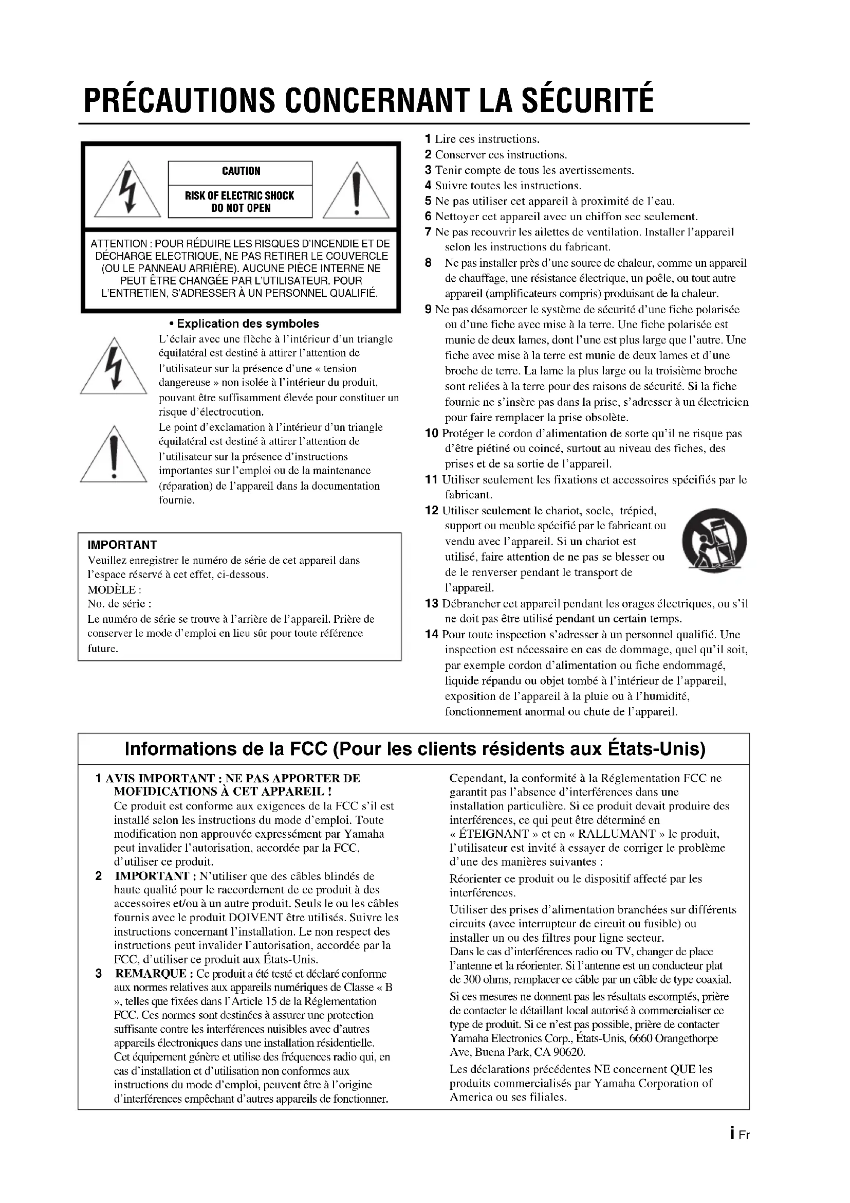 MOFIDICATIONS À CET APPAREIL ! Ce produit est conforme aux exigences de la FCC s’il est installé selon les instructions du mode d’emploi. Toute modification non approuvée expressément par Yamaha peut invalider l’autorisation, accordée par la FCC, d’utiliser ce produit. 2 IMPORTANT : N’utiliser que des câbles blindés de haute qualité pour le raccordement de ce produit à des accessoires et/ou à un autre produit. Seuls le ou les câbles fournis avec le produit DOIVENT être utilisés. Suivre les instructions concernant l’installation. Le non respect des instructions peut invalider l’autorisation, accordée par la FCC, d’utiliser ce produit aux États-Unis. 3 REMARQUE : Ce produit a été testé et déclaré conforme aux normes relatives aux appareils numériques de Classe « B », telles que fixées dans l’Article 15 de la Réglementation FCC. Ces normes sont destinées à assurer une protection suffisante contre les interférences nuisibles avec d’autres appareils électroniques dans une installation résidentielle. Cet équipement génère et utilise des fréquences radio qui, en cas d’installation et d’utilisation non conformes aux instructions du mode d’emploi, peuvent être à l’origine d’interférences empêchant d’autres appareils de fonctionner. Cependant, la conformité à la Réglementation FCC ne garantit pas l’absence d’interférences dans une installation particulière. Si ce produit devait produire des interférences, ce qui peut être déterminé en « ÉTEIGNANT » et en « RALLUMANT » le produit, l’utilisateur est invité à essayer de corriger le problème d’une des manières suivantes : Réorienter ce produit ou le dispositif affecté par les interférences. Utiliser des prises d’alimentation branchées sur différents circuits (avec interrupteur de circuit ou fusible) ou installer un ou des filtres pour ligne secteur. Dans le cas d’interférences radio ou TV, changer de place l’antenne et la réorienter. Si l’antenne est un conducteur plat de 300 ohms, remplacer ce câble par un câble de type coaxial. Si ces mesures ne donnent pas les résultats escomptés, prière de contacter le détaillant local autorisé à commercialiser ce type de produit. Si ce n’est pas possible, prière de contacter Yamaha Electronics Corp., États-Unis, 6660 Orangethorpe Ave, Buena Park, CA 90620. Les déclarations précédentes NE concernent QUE les produits commercialisés par Yamaha Corporation of America ou ses filiales.ii Fr ATTENTION : VEUILLEZ LIRE CE QUI SUIT AVANT D’UTILISER L’APPAREIL. 1 Pour utiliser l’appareil au mieux de ses possibilités, lisez attentivement ce mode d’emploi. Conservez-le soigneusement pour référence. 2 Installez cet appareil dans un endroit frais, bien aéré, sec et propre - à l’abri de la lumière du soleil, des sources de chaleur, des vibrations, des poussières, de l’humidité et/ou du froid. Pour une aération correcte, tenez compte des distances minimales suivantes. À l’arrière : 5 cm Sur les côtés : 5 cm 3 Placez l’appareil loin des équipements, moteurs et transformateurs électriques, pour éviter les ronflements parasites. 4 N’exposez pas l’appareil à des variations brutales de température, ne le placez pas dans un environnement très humide (par exemple dans une pièce contenant un humidificateur) car cela peut entraîner la condensation d’humidité à l’intérieur de l’appareil, qui elle-même peut être responsable de décharge électrique, d’incendie, de dommage à l’appareil ou de blessure corporelle. 5 Evitez d’installer l’appareil dans un endroit où des objets peuvent tomber, ainsi que là où l’appareil pourrait être exposé à des éclaboussures ou des gouttes d’eau. Sur le dessus de l’appareil, ne placez pas : – d’autres appareils qui peuvent endommager la surface de l’appareil ou provoquer sa décoloration. – des objets se consumant (par exemple, une bougie) qui peuvent être responsables d’incendie, de dommage à l’appareil ou de blessure corporelle. – des récipients contenant des liquides qui peuvent être à l’origine de décharge électrique ou de dommage à l’appareil. 6 Ne couvrez pas l’appareil d’un journal, d’une nappe, d’un rideau, etc. car cela empêcherait l’évacuation de la chaleur. Toute augmentation de la température intérieure de l’appareil peut être responsable d’incendie, de dommage à l’appareil ou de blessure corporelle. 7 Ne branchez pas la fiche du cordon d’alimentation de l’appareil sur une prise secteur tant que tous les raccordements n’ont pas été effectués. 8 Ne pas faire fonctionner l’appareil à l’envers. Il risquerait de chauffer et d’être endommagé. 9 N’exercez aucune force excessive sur les commutateurs, les boutons et les cordons. 10 Pour débrancher la fiche du cordon d’alimentation au niveau de la prise secteur, saisissez la fiche et ne tirez pas sur le cordon. 11 Ne nettoyez pas l’appareil au moyen d’un solvant chimique, ce qui pourrait endommager la finition. Utilisez un chiffon sec et propre. 12 N’alimentez l’appareil qu’à partir de la tension prescrite. Alimenter l’appareil sous une tension plus élevée est dangereux et peut être responsable d’incendie, de dommage à l’appareil ou de blessure corporelle. Yamaha ne saurait être tenue responsable des dommages résultant de l’alimentation de l’appareil sous une tension autre que celle prescrite. 13 Pour empêcher tout dommage causé par les éclairs, déconnectez la cordon d’alimentation de la prise murale pendant un orage. 14 Ne tentez pas de modifier ni de réparer l’appareil. Consultez le service Yamaha compétent pour toute réparation qui serait requise. Le coffret de l’appareil ne doit jamais être ouvert, quelle que soit la raison. 15 Si vous envisagez de ne pas vous servir de l’appareil pendant une longue période (par exemple, pendant les vacances),