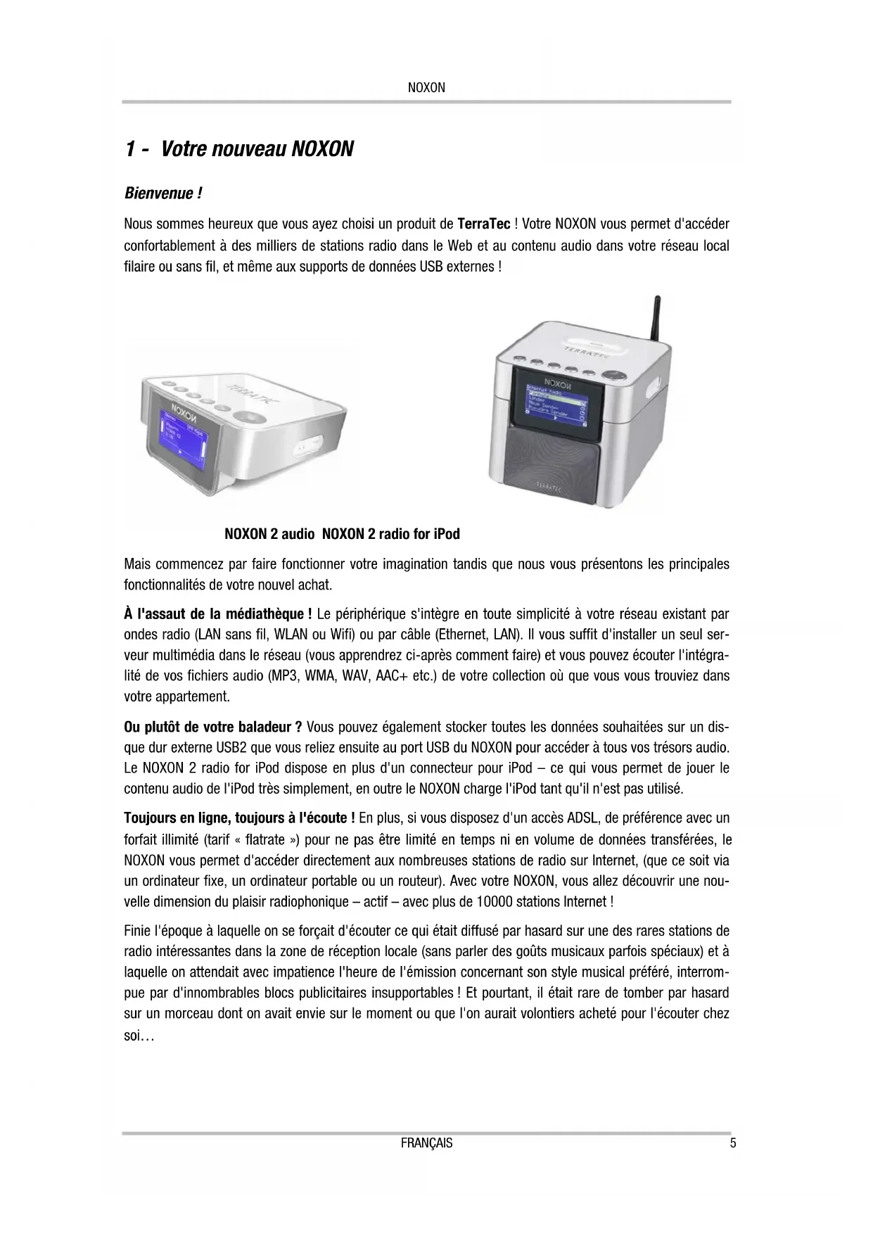 Bienvenue ! Nous sommes heureux que vous ayez choisi un produit de TerraTec ! Votre NOXON vous permet d'accéder confortablement à des milliers de stations radio dans le Web et au contenu audio dans votre réseau local filaire ou sans fil, et même aux supports de données USB externes ! NOXON 2 audio NOXON 2 radio for iPod Mais commencez par faire fonctionner votre imagination tandis que nous vous présentons les principales fonctionnalités de votre nouvel achat. À l'assaut de la médiathèque ! Le périphérique s'intègre en toute simplicité à votre réseau existant par ondes radio (LAN sans fil, WLAN ou Wifi) ou par câble (Ethernet, LAN). Il vous suffit d'installer un seul ser- veur multimédia dans le réseau (vous apprendrez ci-après comment faire) et vous pouvez écouter l'intégra- lité de vos fichiers audio (MP3, WMA, WAV, AAC+ etc.) de votre collection où que vous vous trouviez dans votre appartement. Ou plutôt de votre baladeur ? Vous pouvez également stocker toutes les données souhaitées sur un dis- que dur externe USB2 que vous reliez ensuite au port USB du NOXON pour accéder à tous vos trésors audio. Le NOXON 2 radio for iPod dispose en plus d'un connecteur pour iPod – ce qui vous permet de jouer le contenu audio de l'iPod très simplement, en outre le NOXON charge l'iPod tant qu'il n'est pas utilisé. Toujours en ligne, toujours à l'écoute ! En plus, si vous disposez d'un accès ADSL, de préférence avec un forfait illimité (tarif « flatrate ») pour ne pas être limité en temps ni en volume de données transférées, le NOXON vous permet d'accéder directement aux nombreuses stations de radio sur Internet, (que ce soit via un ordinateur fixe, un ordinateur portable ou un routeur). Avec votre NOXON, vous allez découvrir une nou- velle dimension du plaisir radiophonique – actif – avec plus de 10000 stations Internet ! Finie l'époque à laquelle on se forçait d'écouter ce qui était diffusé par hasard sur une des rares stations de radio intéressantes dans la zone de réception locale (sans parler des goûts musicaux parfois spéciaux) et à laquelle on attendait avec impatience l'heure de l'émission concernant son style musical préféré, interrom- pue par d'innombrables blocs publicitaires insupportables ! Et pourtant, il était rare de tomber par hasard sur un morceau dont on avait envie sur le moment ou que l'on aurait volontiers acheté pour l'écouter chez soi…
