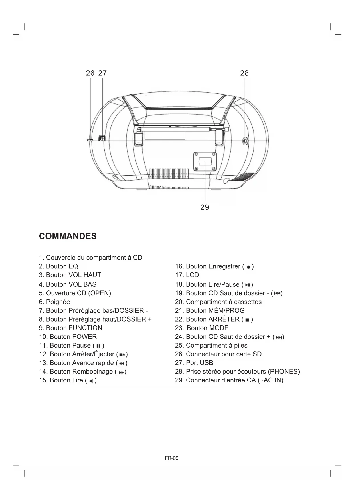 27.Port USB - Prise stéreo pour écouteurs (PHONES)