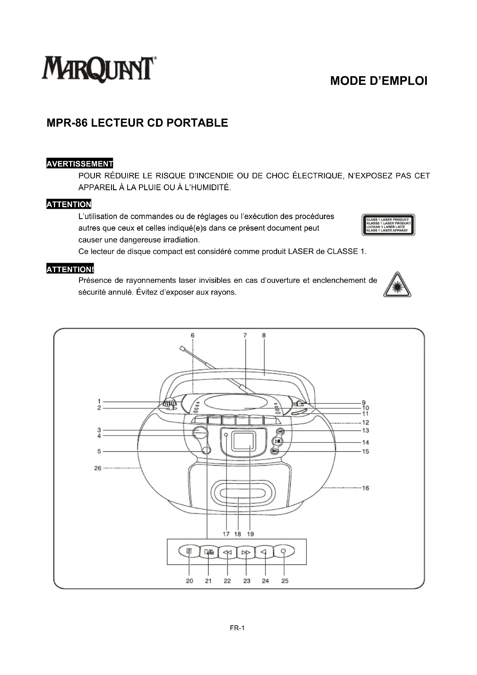AVERTISSEMENT POUR RÉDUIRE LE RISQUE D’INCENDIE OU DE CHOC ÉLECTRIQUE, N’EXPOSEZ PAS CET APPAREIL À LA PLUIE OU À L’HUMIDITÉ. ATTENTION L’utilisation de commandes ou de réglages ou l’exécution des procédures autres que ceux et celles indiqué(e)s dans ce présent document peut causer une dangereuse irradiation. Ce lecteur de disque compact est considéré comme produit LASER de CLASSE 1. ATTENTION! Présence de rayonnements laser invisibles en cas d’ouverture et enclenchement de sécurité annulé. Évitez d’exposer aux rayons.FR-2 A COMMANDES