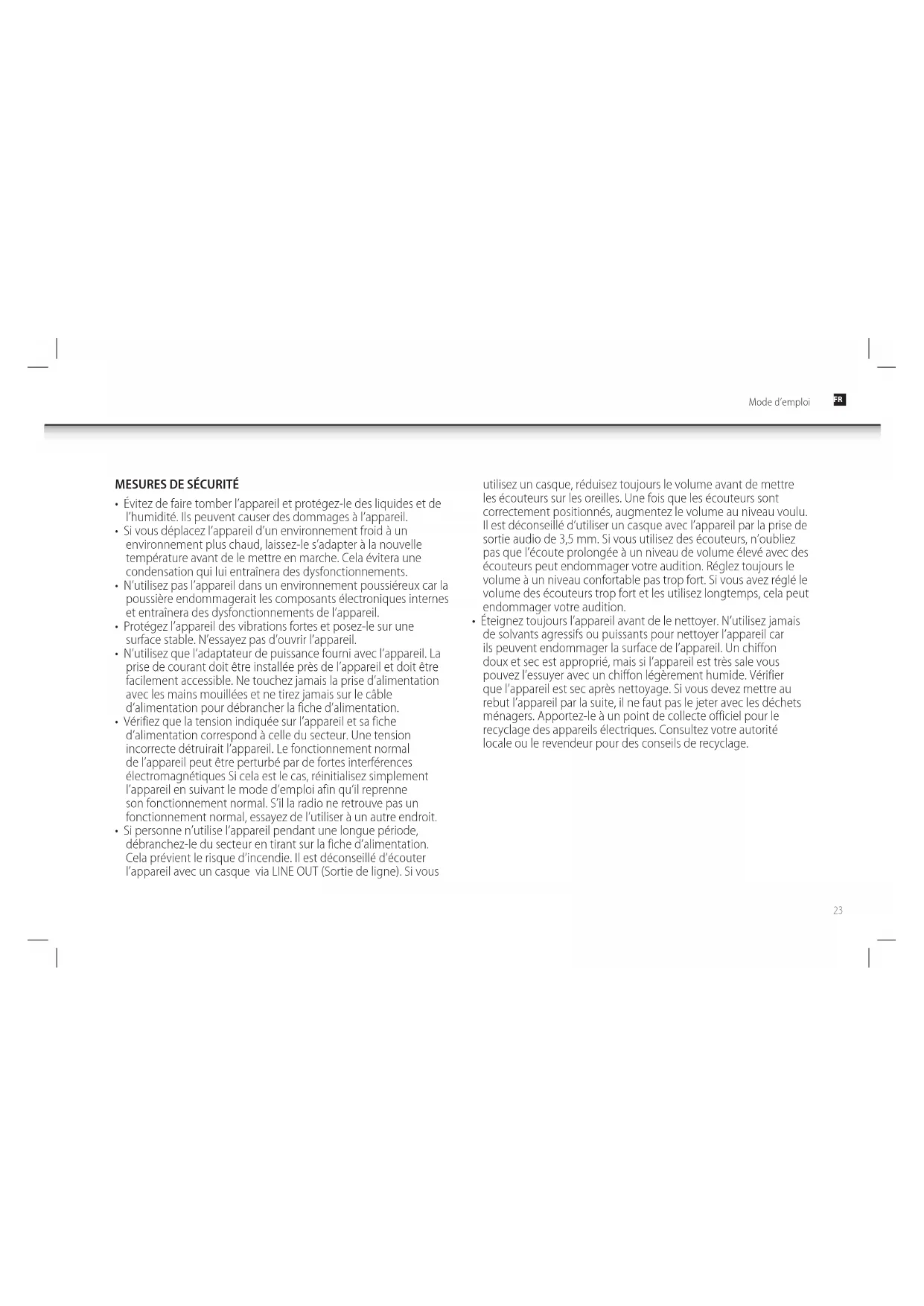 - Éteignez toujours l’appareil avant de le nettoyer. N’utilisez jamais de solvants agressifs ou puissants pour nettoyer l’appareil car ils peuvent endommager la surface de l’appareil. Un chiffon doux et sec est approprié, mais si l’appareil est très sale vous pouvez l’essuyer avec un chiffon légèrement humide. Vérifier que l’appareil est sec après nettoyage. Si vous devez mettre au rebut l’appareil par la suite, il ne faut pas le jeter avec les déchets ménagers. Apportez-le à un point de collecte officiel pour le recyclage des appareils électriques. Consultez votre autorité locale ou le revendeur pour des conseils de recyclage. Mode d’emploi FR24 Mode d’emploi