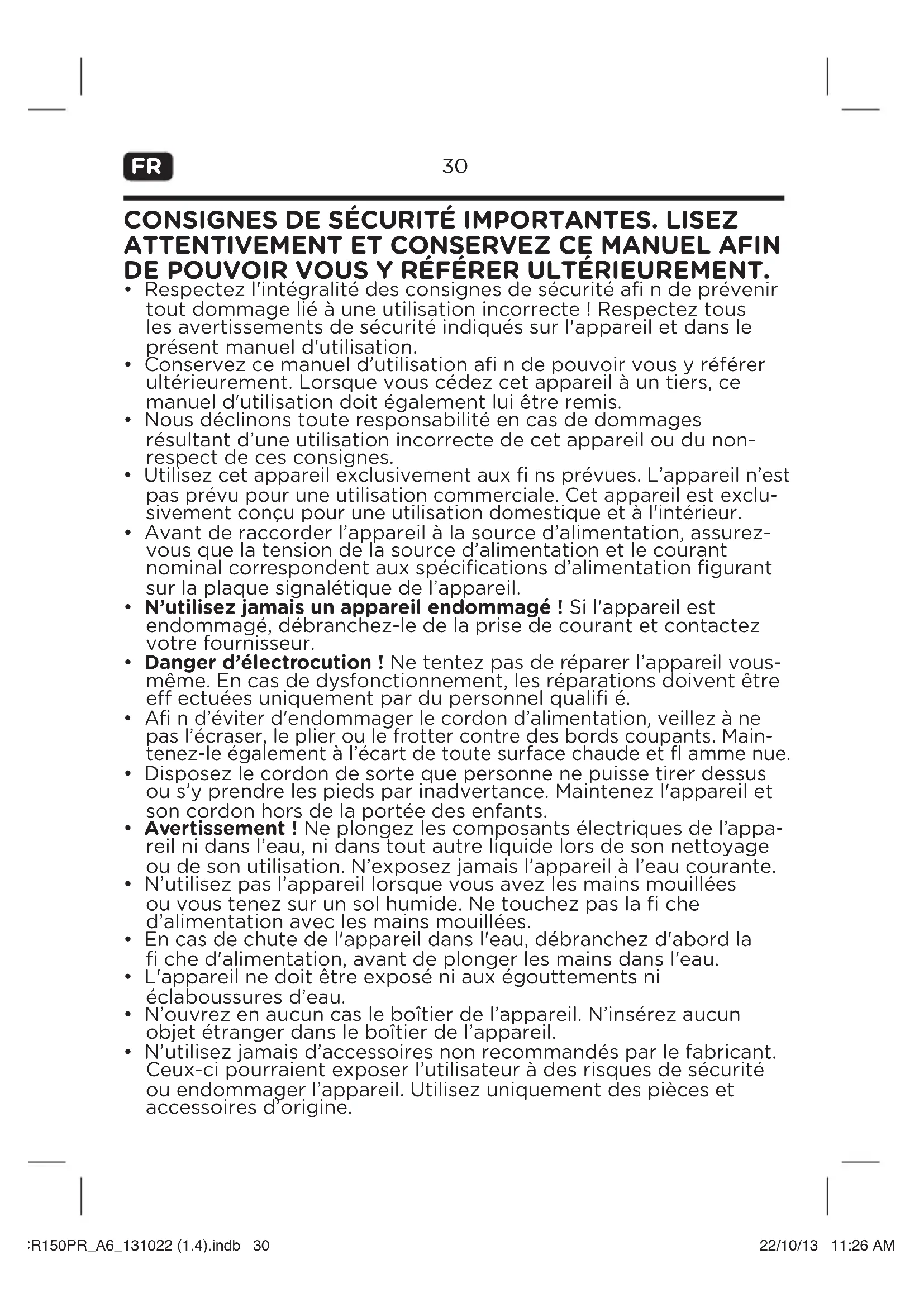 - N’utilisez jamais d’accessoires non recommandés par le fabricant. Ceux-ci pourraient exposer l’utilisateur à des risques de sécurité ou endommager l’appareil. Utilisez uniquement des pièces et accessoires d’origine. OCR150PR_A6_131022 (1.4).indb 30CR150PR_A6_131022 (1.4).indb 30 22/10/13 11:26 AM22/10/13 11:26 AMFR