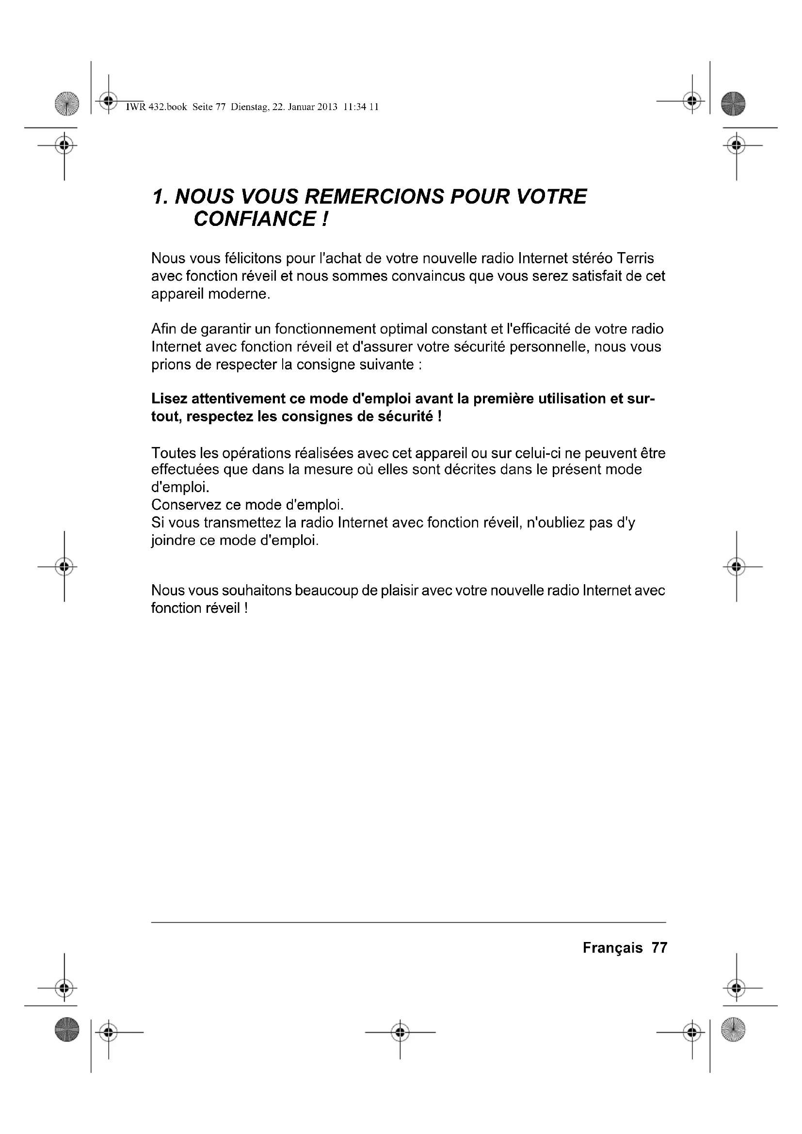 CONFIANCE ! Nous vous félicitons pour l'achat de votre nouvelle radio Internet stéréo Terris avec fonction réveil et nous sommes convaincus que vous serez satisfait de cet appareil moderne. Afin de garantir un fonctionnement optimal constant et l'efficacité de votre radio Internet avec fonction réveil et d'assurer votre sécurité personnelle, nous vous prions de respecter la consigne suivante : Lisez attentivement ce mode d'emploi avant la première utilisation et sur- tout, respectez les consignes de sécurité ! Toutes les opérations réalisées avec cet appareil ou sur celui-ci ne peuvent être effectuées que dans la mesure où elles sont décrites dans le présent mode d'emploi. Conservez ce mode d'emploi. Si vous transmettez la radio Internet avec fonction réveil, n'oubliez pas d'y joindre ce mode d'emploi. Nous vous souhaitons beaucoup de plaisir avec votre nouvelle radio Internet avec fonction réveil ! IWR 432.book Seite 77 Dienstag, 22. Januar 2013 11:34 1178 Français