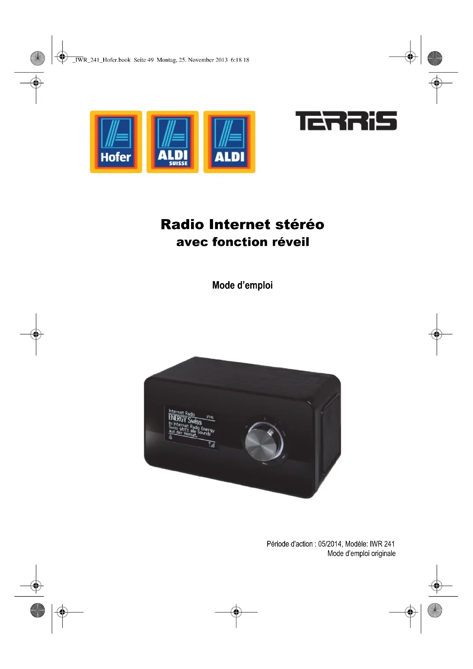 Name des Käufers: ......................................................................................... PLZ/Ort: ......................................................................................... Straße: ......................................................................................... Tel.Nr./E-mail: ......................................................................................... Unterschrift: ......................................................................................... _IWR_241_Hofer.book Seite 48 Montag, 25. November 2013 6:18 18Radio Internet stéréo avec fonction réveil Mode d’emploi Période d'action : 05/2014, Modèle: IWR 241 Mode d’emploi originale _IWR_241_Hofer.book Seite 49 Montag, 25. November 2013 6:18 1850 Nous vous remercions pour votre confiance ! Nous vous félicitons pour l'achat de votre nouvelle radio Internet stéréo Terris avec fonction réveil et nous sommes convaincus que vous serez satisfait de cet appareil moderne. Afin de garantir un fonctionnement optimal constant et l'efficacité de votre radio Internet avec fonction réveil et d'assurer votre sécurité personnelle : Lisez attentivement ce mode d'emploi avant la première utilisation et surtout, respectez les consignes de sécurité ! Nous vous souhaitons beaucoup de plaisir avec votre nouvelle radio Internet avec fonction réveil ! Remarques relatives à la déclaration de conformité Par la présente, la société Globaltronics GmbH & Co. KG déclare que le présent produit est conforme aux exigences fondamen- tales et aux prescriptions applicables de la directive 1999/5/CE (Equipements hertziens et équipements terminaux de télécom- munication), de la directive 2004/108/CE (Compatibilité électro- magnétique), de la directive 2009/125/CE (Exigences en matière d'écoconception applicables aux produits liés à l'énergie), la di- rective 2006/95/CE (Basse tension) ainsi que la directive RoHS 2011/65/UE. Vous trouverez la déclaration de conformité complète ainsi que ce mode d'emploi au format PDF sur Internet à l'adresse www.gt-support.de. _IWR_241_Hofer.book Seite 50 Montag, 25. November 2013 6:18 1851 Eléments livrés Français Vue d'ensemble des données