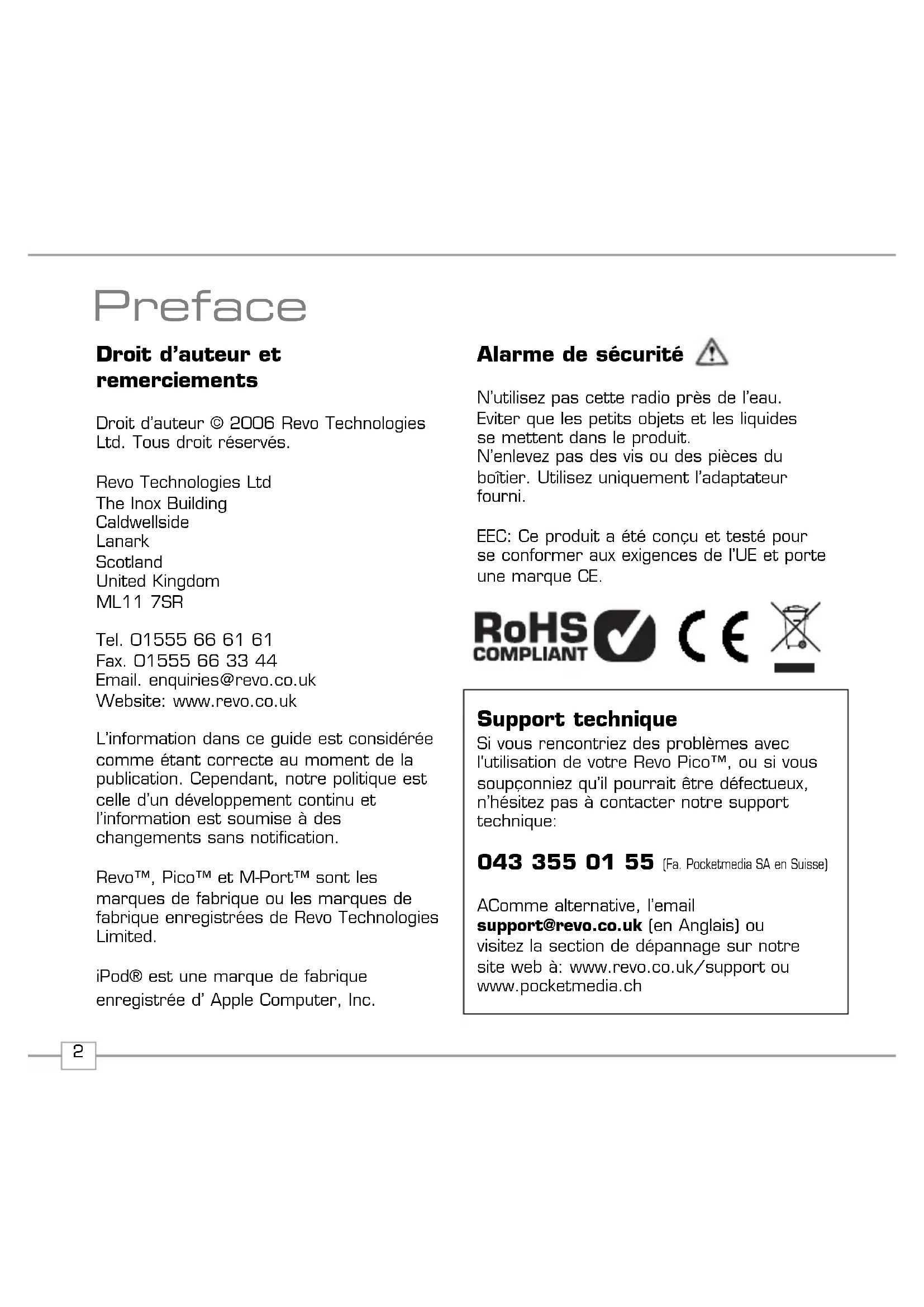 AComme alternative, l'email support@revo.co.uk (en Anglais) ou visitez la section de depannage sur notre site web à: www.revo.co.uk/support ou www.pocketmedia.ch