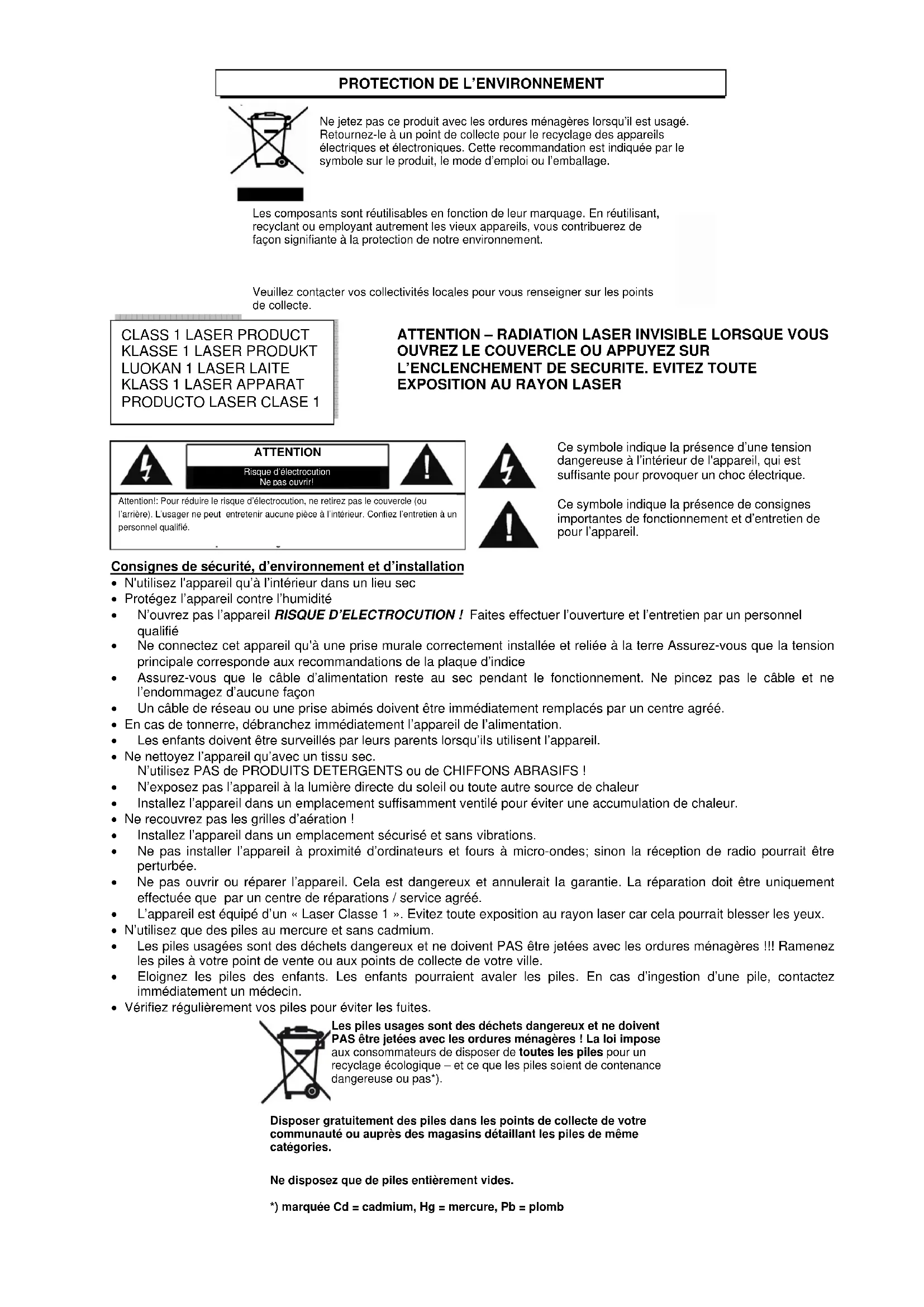 - Ne pas ouvrir ou réparer l'appareil. Cela est dangereux et annulerait la garantie. La réparation doit être uniquement effectuée par un centre de réparations / service agréé. L'appareil est equipped d'un « Laser Classe 1 ». Evitez toute exposition au rayon laser car cela pourrait blesser les yeux.