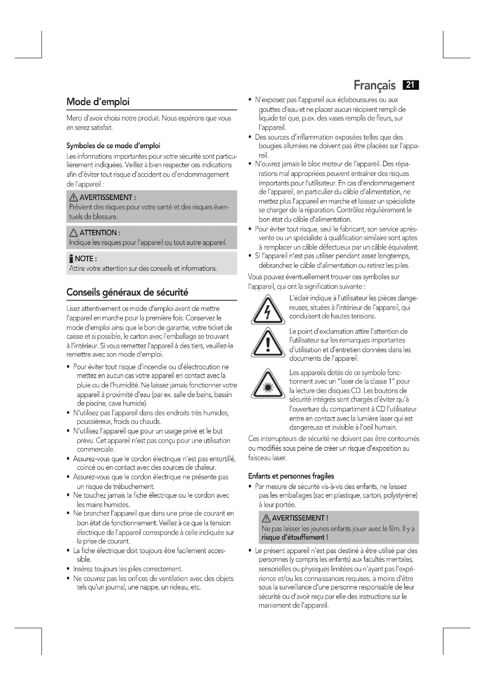 Prévient des risques pour votre santé et des risques éven- tuels de blessure. ATTENTION : Indique les risques pour l’appareil ou tout autre appareil. NOTE : Attire votre attention sur des conseils et informations. Conseils généraux de sécurité Lisez attentivement ce mode d’emploi avant de mettre l’appareil en marche pour la première fois. Conservez le mode d’emploi ainsi que le bon de garantie, votre ticket de caisse et si possible, le carton avec l’emballage se trouvant à l’intérieur. Si vous remettez l‘appareil à des tiers, veuillez-le remettre avec son mode d‘emploi.