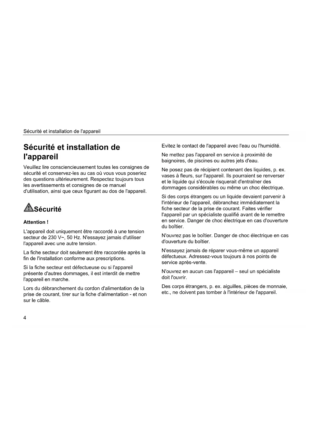 Sécurité et installation de l'appareil Veuillez lire consciencieusement toutes les consignes de sécurité et conservez-les au cas où vous vous poseriez des questions ultérieurement. Respectez toujours tous les avertissements et consignes de ce manuel d'utilisation, ainsi que ceux figurant au dos de l'appareil. Sécurité Attention ! L'appareil doit uniquement être raccordé à une tension secteur de 230 V~, 50 Hz. N'essayez jamais d'utiliser l'appareil avec une autre tension. La fiche secteur doit seulement être raccordée après la fin de l'installation conforme aux prescriptions. Si la fiche secteur est défectueuse ou si l'appareil présente d'autres dommages, il est interdit de mettre l'appareil en marche. Lors du débranchement du cordon d'alimentation de la prise de courant, tirer sur la fiche d'alimentation - et non sur le câble. Evitez le contact de l'appareil avec l'eau ou l'humidité. Ne mettez pas l'appareil en service à proximité de baignoires, de piscines ou autres jets d'eau. Ne posez pas de récipient contenant des liquides, p. ex. vases à fleurs, sur l'appareil. Ils pourraient se renverser et le liquide qui s'écoule risquerait d'entraîner des dommages considérables ou même un choc électrique. Si des corps étrangers ou un liquide devaient parvenir à l'intérieur de l'appareil, débranchez immédiatement la fiche secteur de la prise de courant. Faites vérifier l'appareil par un spécialiste qualifié avant de le remettre en service. Danger de choc électrique en cas d'ouverture du boîtier. N'ouvrez pas le boîtier. Danger de choc électrique en cas d'ouverture du boîtier. N'essayez jamais de réparer vous-même un appareil défectueux. Adressez-vous toujours à nos points de service après-vente. N'ouvrez en aucun cas l'appareil – seul un spécialiste doit l'ouvrir. Des corps étrangers, p. ex. aiguilles, pièces de monnaie, etc., ne doivent pas tomber à l'intérieur de l'appareil.Sécurité et installation de l'appareil