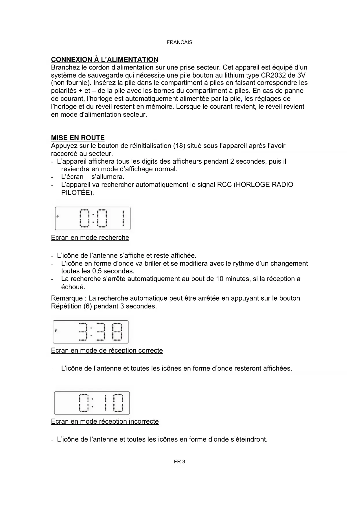 Appuyez sur le bouton de réinitialisation (18) situé sous l’appareil après l’avoir raccordé au secteur. - L’appareil affichera tous les digits des afficheurs pendant 2 secondes, puis il reviendra en mode d’affichage normal. - L’écran s’allumera. - L’appareil va rechercher automatiquement le signal RCC (HORLOGE RADIO PILOTÉE).