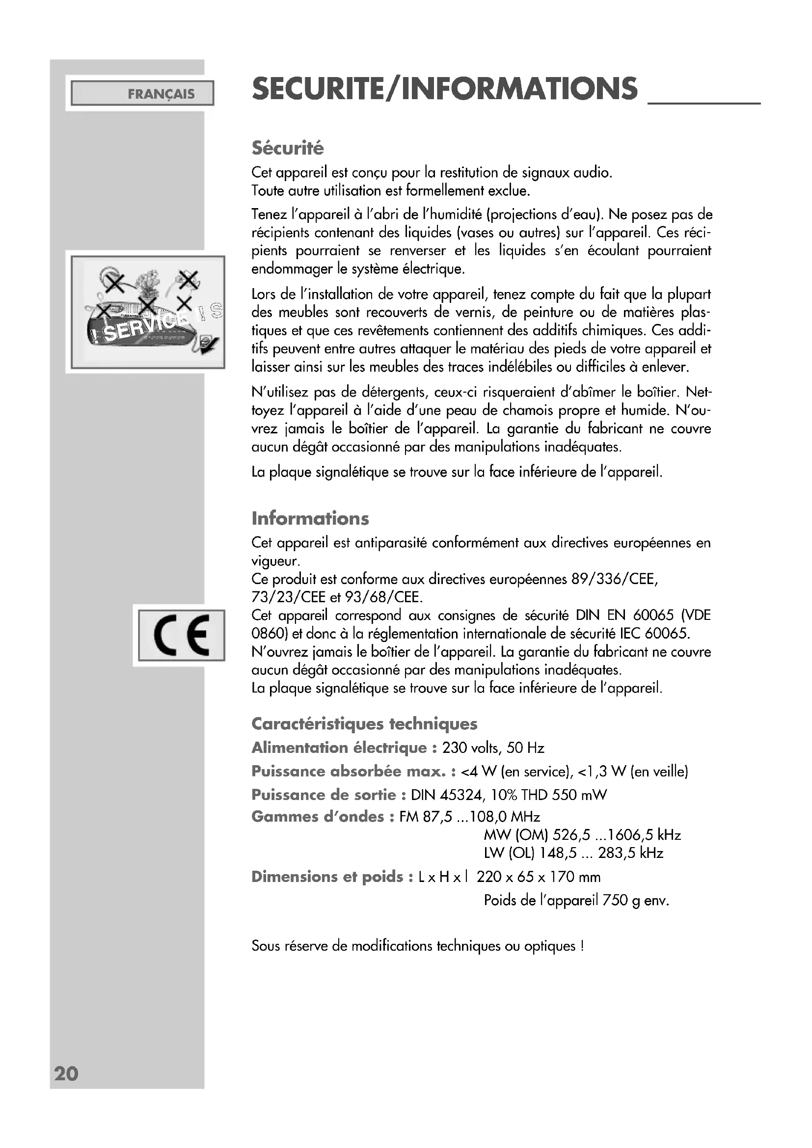 ALARM 1ALARM 2FM 88 90 96 100 104 106 108 MHzMW 530 600 700 850 1000 1200 1400 1600 kHzLW 150 175 200 225 250 270 283 kHz ! SERVICE !! SERVICE ! ! SERVICE ! Sécurité Cet appareil est conçu pour la restitution de signaux audio.Toute autre utilisation est formellement exclue.Tenez l’appareil à l’abri de l’humidité (projections d’eau). Ne posez pas derécipients contenant des liquides (vases ou autres) sur l’appareil. Ces réci-pients pourraient se renverser et les liquides s’en écoulant pourraientendommager le système électrique.Lors de l’installation de votre appareil, tenez compte du fait que la plupartdes meubles sont recouverts de vernis, de peinture ou de matières plas-tiques et que ces revêtements contiennent des additifs chimiques. Ces addi-tifs peuvent entre autres attaquer le matériau des pieds de votre appareil etlaisser ainsi sur les meubles des traces indélébiles ou difficiles à enlever.N’utilisez pas de détergents, ceux-ci risqueraient d’abîmer le boîtier. Net-toyez l’appareil à l’aide d’une peau de chamois propre et humide. N’ou-vrez jamais le boîtier de l’appareil. La garantie du fabricant ne couvreaucun dégât occasionné par des manipulations inadéquates.La plaque signalétique se trouve sur la face inférieure de l’appareil. Informations Cet appareil est antiparasité conformément aux directives européennes envigueur.Ce produit est conforme aux directives européennes 89/336/CEE,73/23/CEE et 93/68/CEE.Cet appareil correspond aux consignes de sécurité DIN EN 60065 (VDE0860) et donc à la réglementation internationale de sécurité IEC 60065.N’ouvrez jamais le boîtier de l’appareil. La garantie du fabricant ne couvreaucun dégât occasionné par des manipulations inadéquates.La plaque signalétique se trouve sur la face inférieure de l’appareil.Caractéristiques techniquesAlimentation électrique : 230 volts, 50 HzPuissance absorbée max. : <4 W (en service), <1,3 W (en veille)Puissance de sortie : DIN 45324, 10% THD 550 mWGammes d’ondes : FM 87,5 ...108,0 MHzMW (OM) 526,5 ...1606,5 kHzLW (OL) 148,5 ... 283,5 kHzDimensions et poids : L x H x l 220 x 65 x 170 mmPoids de l’appareil 750 g env.Sous réserve de modifications techniques ou optiques !FRANÇAIS