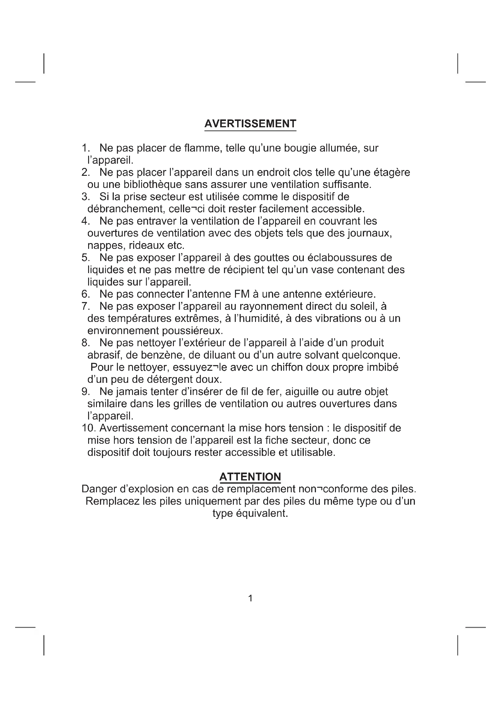mise hors tension de l’appareil est la che secteur, donc ce dispositif doit toujours rester accessible et utilisable. ATTENTION Danger d’explosion en cas de remplacement non¬conforme des piles. Remplacez les piles uniquement par des piles du même type ou d’un type équivalent.