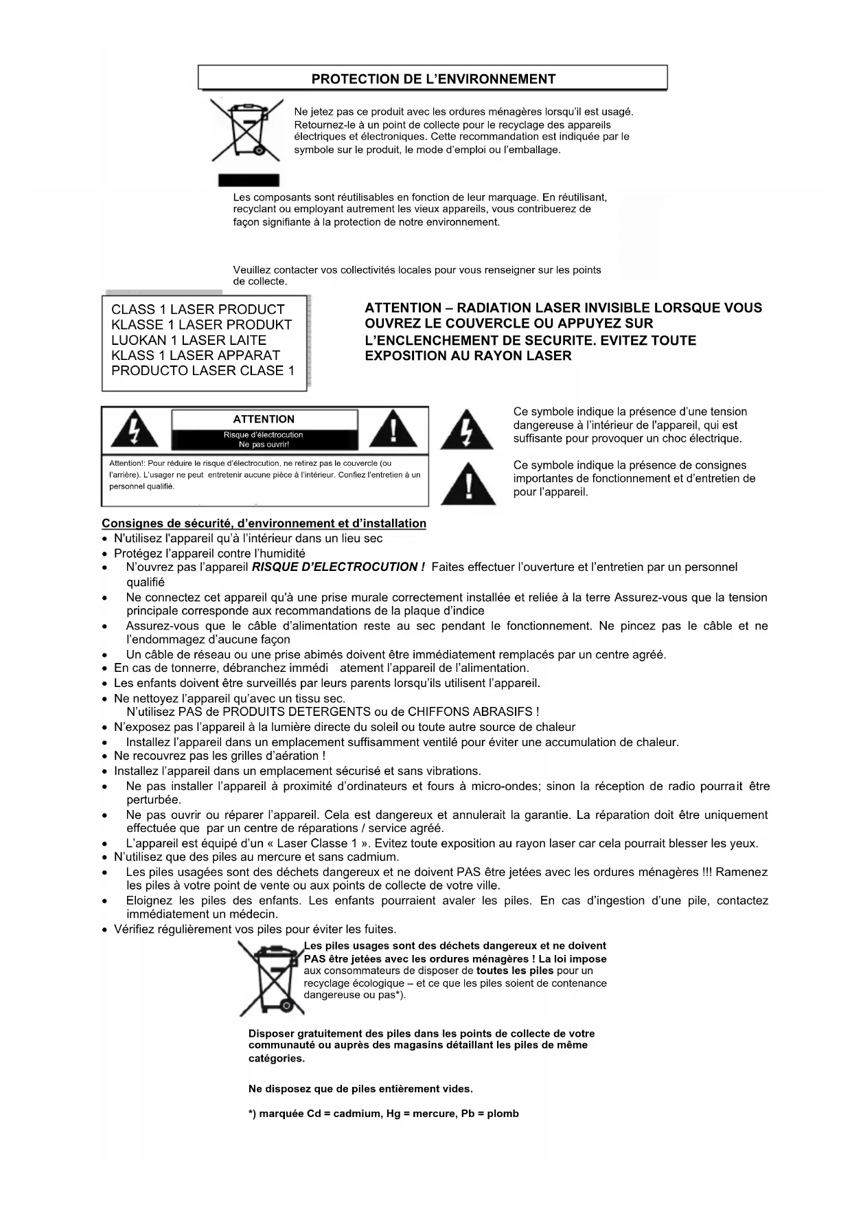 Lappareil est equiped'un « Laser Classe 1 » . Evitez toute exposition au rayon laser car cela pourrait blesser les yeux.