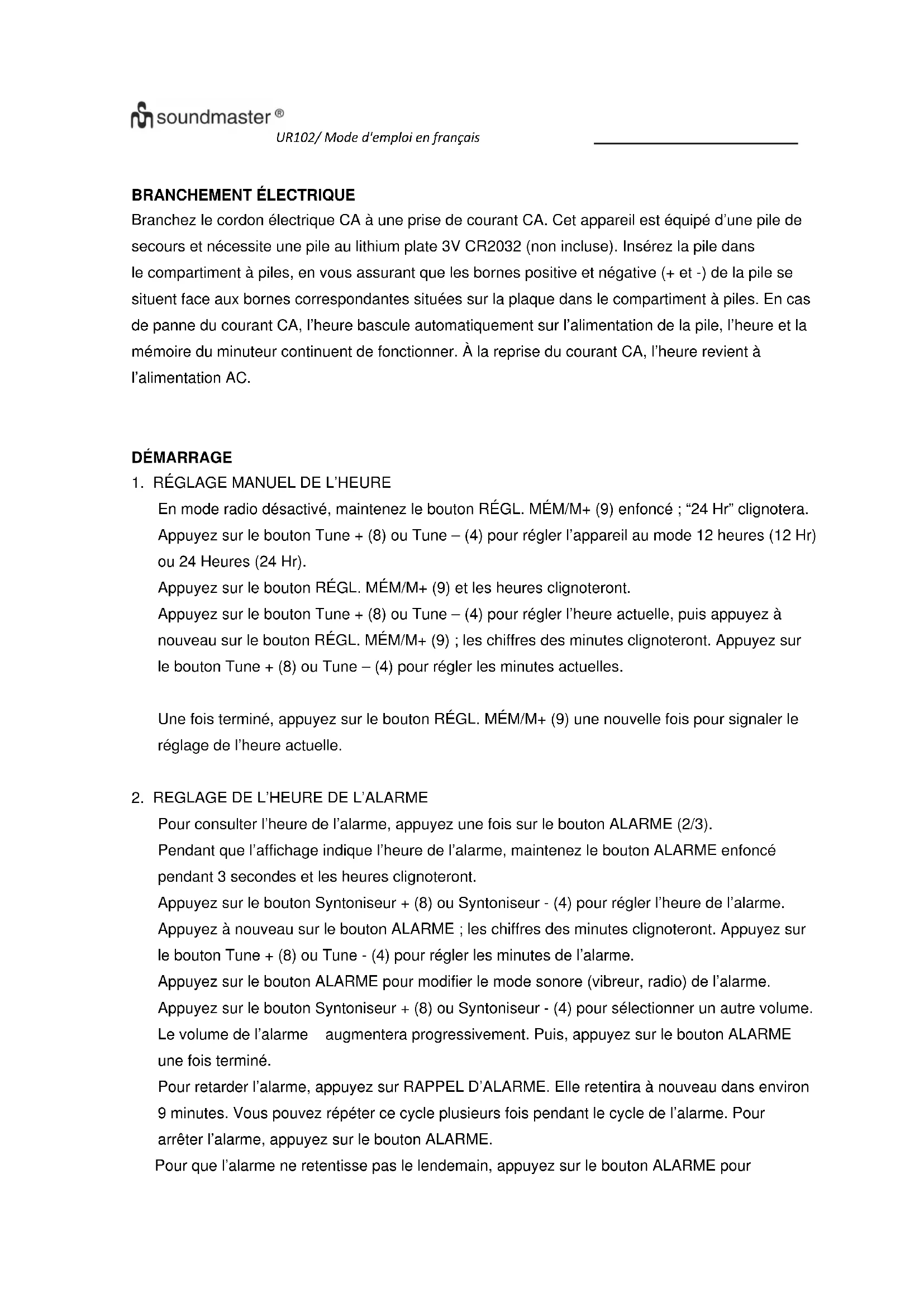 UR102 - Radio-réveil Soundmaster - Notice d'utilisation et mode d'emploi gratuit