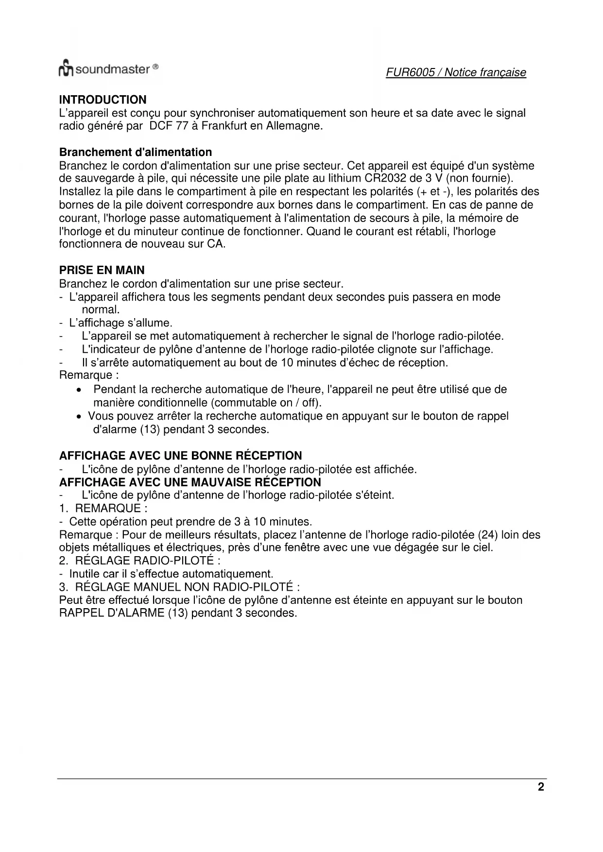 Retrouvez gratuitement la notice de l'appareil FUR6005 Soundmaster au format PDF.