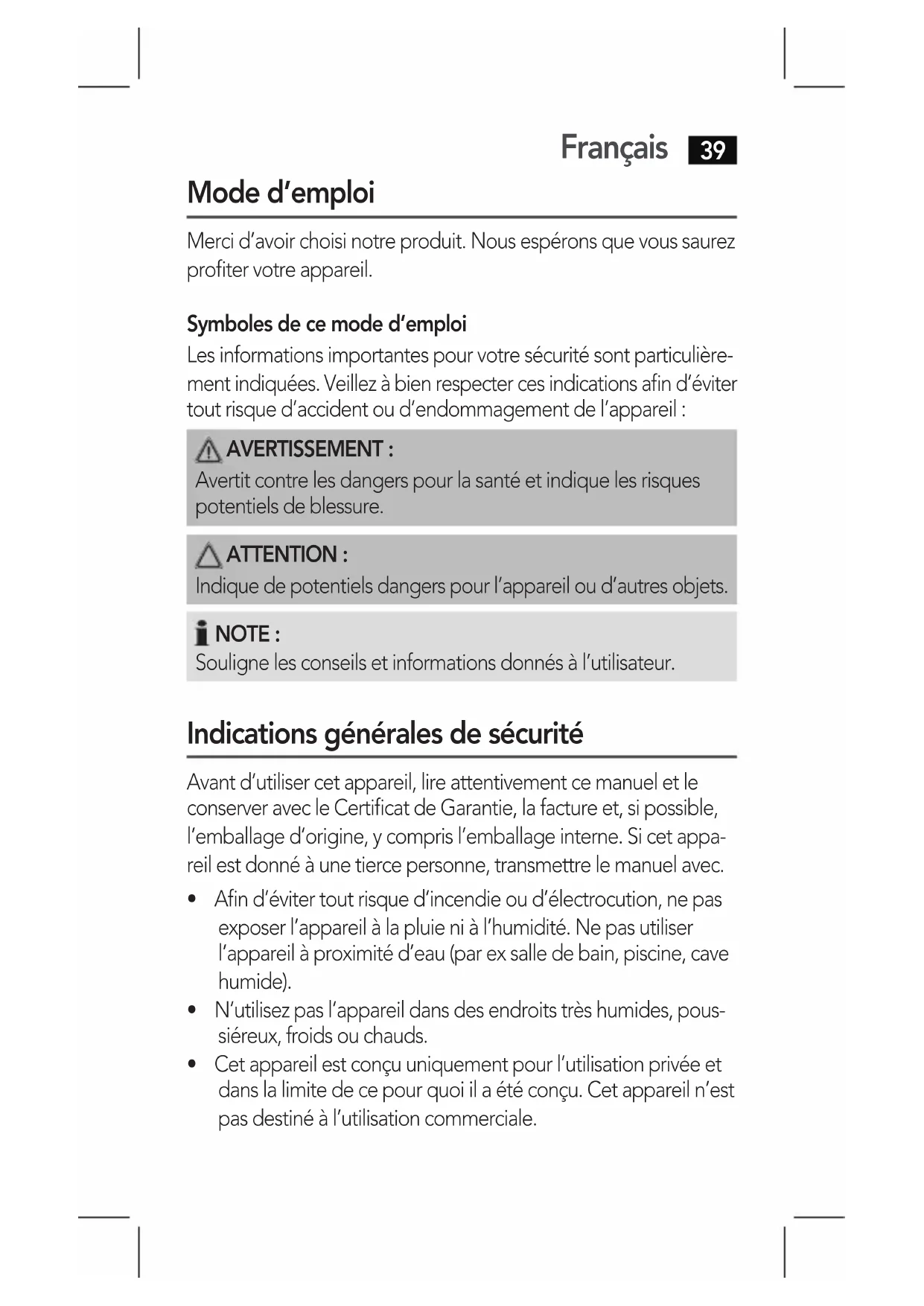 Avertit contre les dangers pour la santé et indique les risques potentiels de blessure. ATTENTION : Indique de potentiels dangers pour l’appareil ou d’autres objets. NOTE : Souligne les conseils et informations donnés à l’utilisateur. Indications générales de sécurité Avant d’utiliser cet appareil, lire attentivement ce manuel et le conserver avec le Certificat de Garantie, la facture et, si possible, l’emballage d’origine, y compris l’emballage interne. Si cet appa- reil est donné à une tierce personne, transmettre le manuel avec.