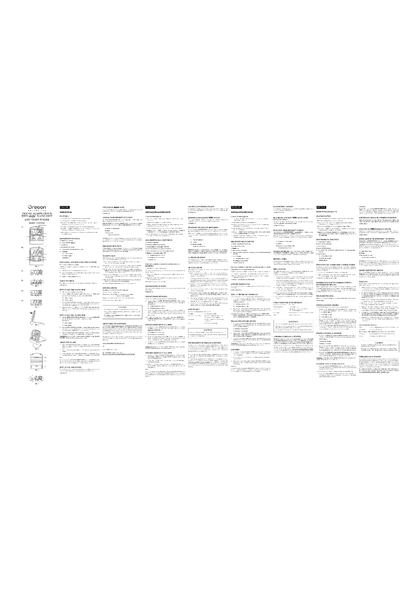 Premere il pulsante [NIGHT FINDER] una volta: sul display compare il simbolo e la retroilluminazione si accende in modo intermittente per alcuni secondi.Nota: la funzione Nightfinder™ e studiata per essere usata in ambienti molto scuri.In condizioni di luce normale, la luce intermittente del display non e chiaramentevisibile.G. Pulsante NightfinderH. CicalinoI. Coperchio batteria[VEDI FIG. 6 R FIG 7.] IMPORTANTE: per evitare che la batteria si scarichi, il Nightfinder™ va utilizzato solamentein ambienti non familiari, come ad essempio in una stanza d’albergo.L’uso pro lingato provoca una riduzone significativa della durata della batteria. LA FUNZIONE RESET Se l’orologio non funziona correttamente, togliere la batteria. Attendere 30 secondi,quindi reinserire la batteria nell’apposito vano per resettare il display dell’ orologio.Dopodiche bisognera impostare nuovamente l’ora e l’allarme. MANUTENZIONE Osservando i seguenti suggerimenti,il Travel Alarm Clock grantira un rendimentoefficiente per molti anni.1. Tenere l’orologio in un ambiente asciutto. Se si bagna, asciugarloimmediatamente. 1 liquidi possono contenere sostanze minerali che possonocorrodere i circuiti elettronici.2. L’orologio va utilizzato e conservato in ambienti a temperature normali. Gliestremi di temperatura possono accorciare la durata dei dispositivi elettronici,danneggiare le batterie e deformare o sciogliere i componenti di plastica.3. Maneggiare l’orologio con delicatezza ed attenzione Le cadute possonodanneggiare le schede di circuito e provocare così un funzionamento scorrettodel Travel Alarm Clock.4. Tenere l’orologio al riparo da polvere e sporco, che possoao causare l’usuraprematura dei componenti.5. Pulire occasionalmente l’orologio con unpanno umido per mantenerneintatto l’aspetto. Non pulire l’orologio con sostanze chimiche, solventi odetergenti forti.6. Usare solamente batterie nuove delle dimensioni e del tipo richiesti. Rimuoveresempre le batterie scariche o consumate, poiche possono far disperdere sostanzchimiche che possono danneggiare i circuitti elettronici.7. La modifica o la manomissione dei componenti interni dell’oroologio puocausare un malfunzionamento e puo rendere nulla la granzia. DATI TECNICI Temperatura di funzionamento : da 0°C a 50°CPrecisione : +/- 0.5 secondi al giornoSorgente di alimentazione : Una batteria alcalina pc UM-4 o “AAA”(richiesta una batteria alcalina)Dimensioni : 82 x 64 x 15 mm/3.23 x 2.52 x 0.6 inch(A x L x P)Peso : 45 g/1.6 oz (senza batteria) CAUTION - Il contenuto di questo manuale soggetto a modifiche senza preavviso.- Per ragioni tipografiche, le videate mostrate in questo n anuale possonodifferire dalle videate effettive. INFORMAZIONI SU OREGON SCIENTIFIC Per avere maggiori informazioni sui nuovi prodotti Oregon Scientific, come lefotocamere digitali, il lettori MP3, i computer didattici per ragazzi, gli orologi conproiezione dell’ora, le stazioni barometriche, gli orologi da polso multifunzione,gli strumenti per la cura della persona ed il fitness, ed altro ancora, visita il nostrosito internet www.oregonscientific.comPuoi trovare anche le informazioni necessarie per contattare il nostro servizio clienti,le risposte ad alcune domande più frequenti (FAQ) o i software da scaricaregratuitamente.Sul nostro sito internet potrai trovare tutte le informazioni di cui hai bisogno, ma sedesideri contattare direttamente il nostro Servizio Consumatori puoi visitare il sitowww2.oregonscientific.com/service/support oppure chiamare al 949-608-2848(numero valido esclusivamente per gli USA). Per ricerche di tipo internazionalepuoi visitare invece il sito www2.oregonscientific.com/about/international/default.asp