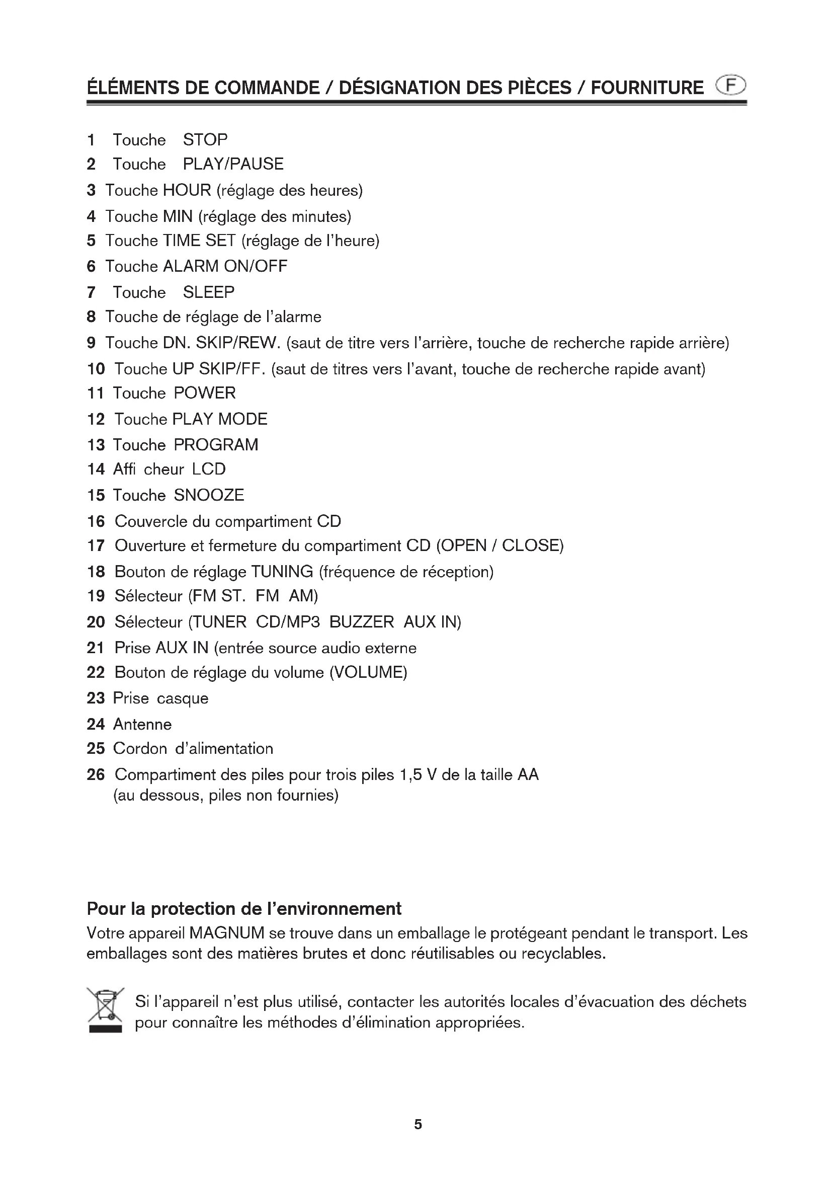 MAGNUM CDR 209 (F).indd 4MAGNUM CDR 209 (F).indd 4 19.09.2005 14:25:55 Uhr19.09.2005 14:25:55 Uhr5 ÉLÉMENTS DE COMMANDE / DÉSIGNATION DES PIÈCES / FOURNITURE 1 Touche STOP 2 Touche PLAY/PAUSE 3 Touche HOUR (réglage des heures) 4 Touche MIN (réglage des minutes) 5 Touche TIME SET (réglage de l’heure) 6 Touche ALARM ON/OFF 7 Touche SLEEP 8 Touche de réglage de l’alarme 9 Touche DN. SKIP/REW. (saut de titre vers l’arrière, touche de recherche rapide arrière) 10 Touche UP SKIP/FF. (saut de titres vers l’avant, touche de recherche rapide avant) 11 Touche POWER 12 Touche PLAY MODE 13 Touche PROGRAM 14 Affi cheur LCD 15 Touche SNOOZE 16 Couvercle du compartiment CD 17 Ouverture et fermeture du compartiment CD (OPEN / CLOSE) 18 Bouton de réglage TUNING (fréquence de réception) 19 Sélecteur (FM ST. FM AM) 20 Sélecteur (TUNER CD/MP3 BUZZER AUX IN) 21 Prise AUX IN (entrée source audio externe 22 Bouton de réglage du volume (VOLUME) 23 Prise casque 24 Antenne 25 Cordon d’alimentation 26 Compartiment des piles pour trois piles 1,5 V de la taille AA (au dessous, piles non fournies) Pour la protection de l’environnement Votre appareil MAGNUM se trouve dans un emballage le protégeant pendant le transport. Les emballages sont des matières brutes et donc réutilisables ou recyclables. Si l’appareil n’est plus utilisé, contacter les autorités locales d’évacuation des déchets pour connaître les méthodes d’élimination appropriées. MAGNUM CDR 209 (F).indd 5MAGNUM CDR 209 (F).indd 5 19.09.2005 14:29:20 Uhr19.09.2005 14:29:20 Uhr6