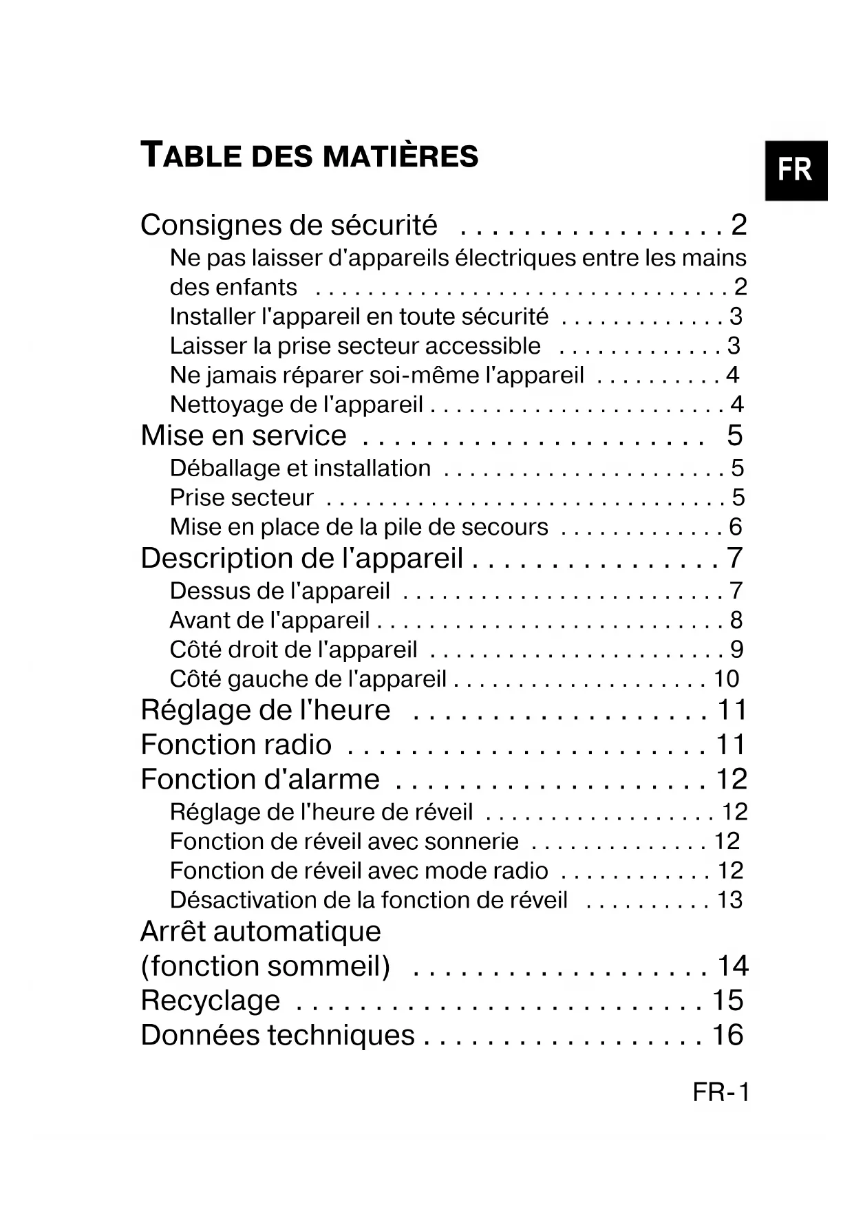 FR TABLE DES MATIÈRES Consignes de sécurité . . . . . . . . . . . . . . . . . 2 Ne pas laisser d'appareils électriques entre les mains des enfants . . . . . . . . . . . . . . . . . . . . . . . . . . . . . . . . 2Installer l'appareil en toute sécurité . . . . . . . . . . . . . 3Laisser la prise secteur accessible . . . . . . . . . . . . . 3Ne jamais réparer soimême l'appareil . . . . . . . . . . 4Nettoyage de l'appareil . . . . . . . . . . . . . . . . . . . . . . . 4 Mise en service . . . . . . . . . . . . . . . . . . . . . . 5 Déballage et installation . . . . . . . . . . . . . . . . . . . . . . 5Prise secteur . . . . . . . . . . . . . . . . . . . . . . . . . . . . . . . 5Mise en place de la pile de secours . . . . . . . . . . . . . 6 Description de l'appareil . . . . . . . . . . . . . . . . 7 Dessus de l'appareil . . . . . . . . . . . . . . . . . . . . . . . . . 7Avant de l'appareil . . . . . . . . . . . . . . . . . . . . . . . . . . . 8Côté droit de l'appareil . . . . . . . . . . . . . . . . . . . . . . . 9Côté gauche de l'appareil . . . . . . . . . . . . . . . . . . . . 10 Réglage de l'heure . . . . . . . . . . . . . . . . . . . 11