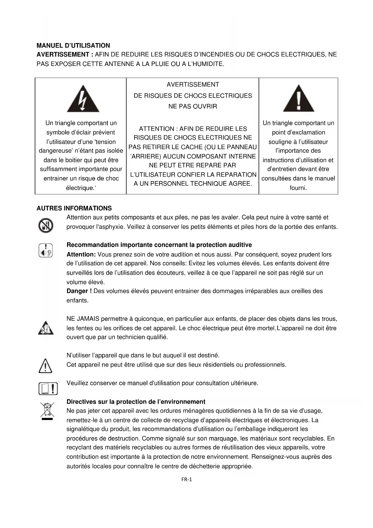 A UN PERSONNEL TECHNIQUE AGREE. Un triangle comportant un point d’exclamation souligne à l’utilisateur l’importance des instructions d’utilisation et d’entretien devant être consultées dans le manuel fourni. AUTRES INFORMATIONS Attention aux petits composants et aux piles, ne pas les avaler. Cela peut nuire à votre santé et provoquer l'asphyxie. Veillez à conserver les petits éléments et piles hors de la portée des enfants.
