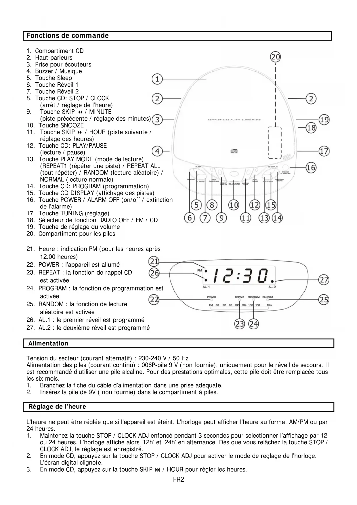 volume sonore à l’aide du bouton VOLUME. En appuyant sur la touche STOP / CLOCK ADJ, la lecture du CD s’arrête. Remarque : si vous appuyez sur la touche CD DISPLAY, le numéro de la piste du CD est affiché quelques secondes, puis l’heure s’affiche à nouveau. Les fonctions ‘Pause’ et ‘Skip’