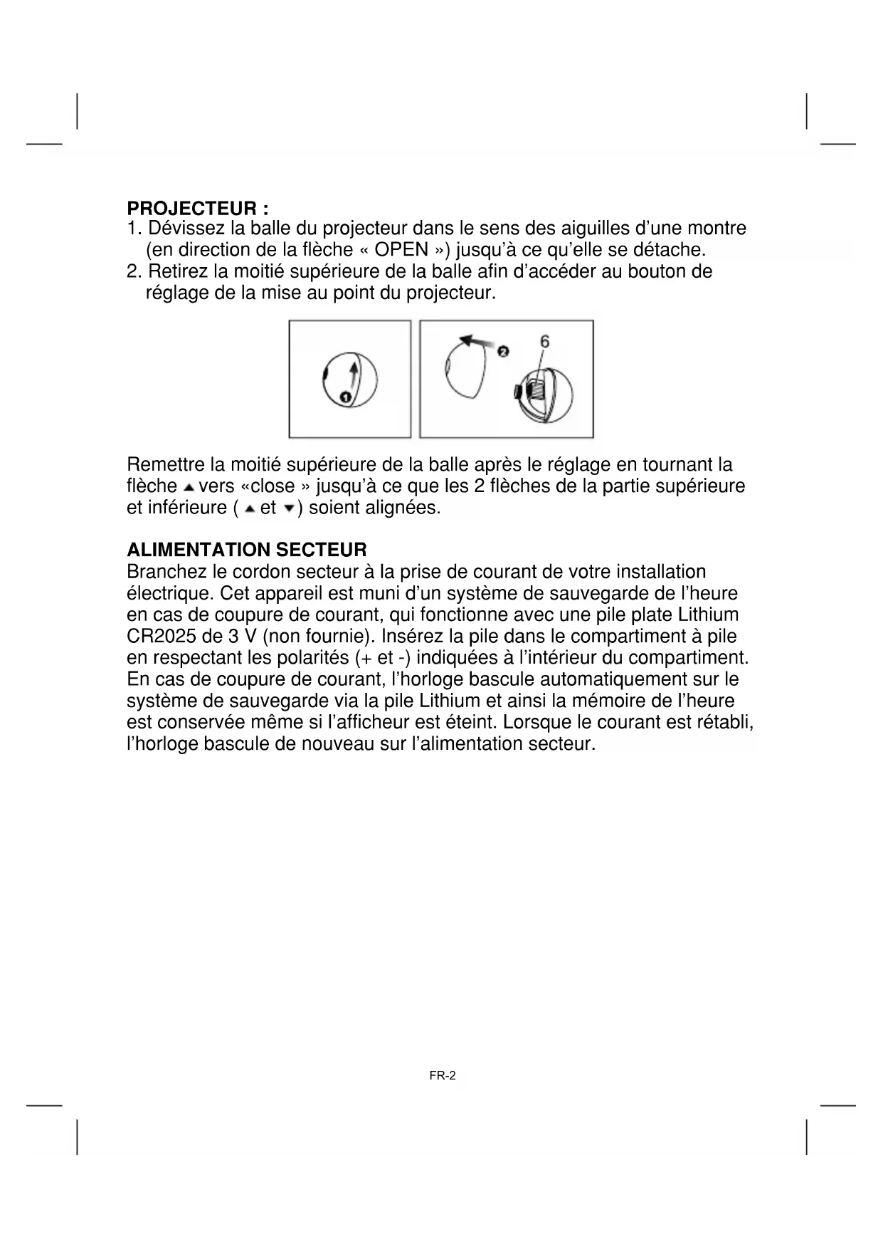 FRENCH FR-1Remettre la moitié supérieure de la balle après le réglage en tournant la flèche vers «close » jusqu’à ce que les 2 flèches de la partie supérieure et inférieure ( et ) soient alignées. ALIMENTATION SECTEUR Branchez le cordon secteur à la prise de courant de votre installation électrique. Cet appareil est muni d’un système de sauvegarde de l’heure en cas de coupure de courant, qui fonctionne avec une pile plate Lithium CR2025 de 3 V (non fournie). Insérez la pile dans le compartiment à pile en respectant les polarités (+ et -) indiquées à l’intérieur du compartiment. En cas de coupure de courant, l’horloge bascule automatiquement sur le système de sauvegarde via la pile Lithium et ainsi la mémoire de l’heure est conservée même si l’afficheur est éteint. Lorsque le courant est rétabli, l’horloge bascule de nouveau sur l’alimentation secteur. PROJECTEUR :