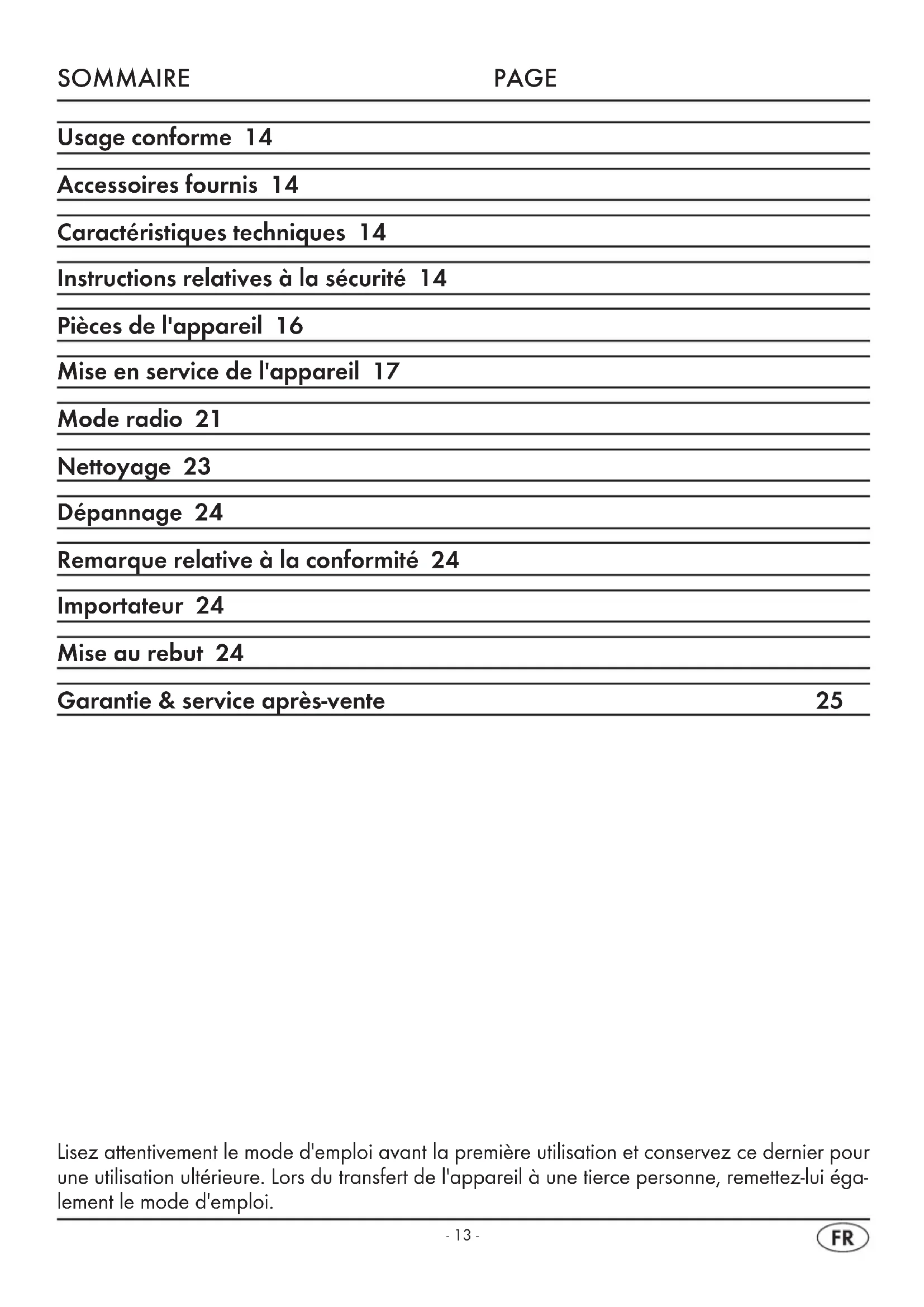 , 50 Hz Puissance absorbée en mode radio : 5 watts Veille : 1,2 watts Puissance de sortie : 2 x 450 mW à 10% THD Plage de fréquences : OUC (FM) 87,5 ‒ 108 MHz OM (AM) 526,5 ‒ 1606,5 kHz Température de service : + 5 ‒ +35°C Température d'entreposage : -20 ‒ +50 °C Humidité : 5 - 90 % (pas de condensation) Dimensions (l x H x P) : 21 x 7 x 14,1 cm Poids : env. 870 g Classe de protection : II / Piles de sauvegarde : 2 x 1,5 V, de type AAA/Micro (non fournies) Instructionsrelativesàlasécurité Avertissement Un avertissement de ce niveau de danger signale une situation potentiellement dan- gereuse. Des accidents peuvent résulter de l'incapacité à éviter la situation dangereuse. Voilà pourquoi il est important de suivre les instructions gurant dans cet avertissement, pour éviter que des personnes ne soient bles- sées. Attention Un avertissement de ce niveau de danger si- gnale un dommage matériel potentiel. Si vous ne pouvez éviter la situation dangereuse, cela peut entraîner des dommages matériels. Suivre les instructions dans cet avertissement, pour éviter tous dommages matériels. Remarque Une remarque signale des informations sup- plémentaires qui facilitent la manipulation de l'appareil. Attention : risque de choc électrique !
