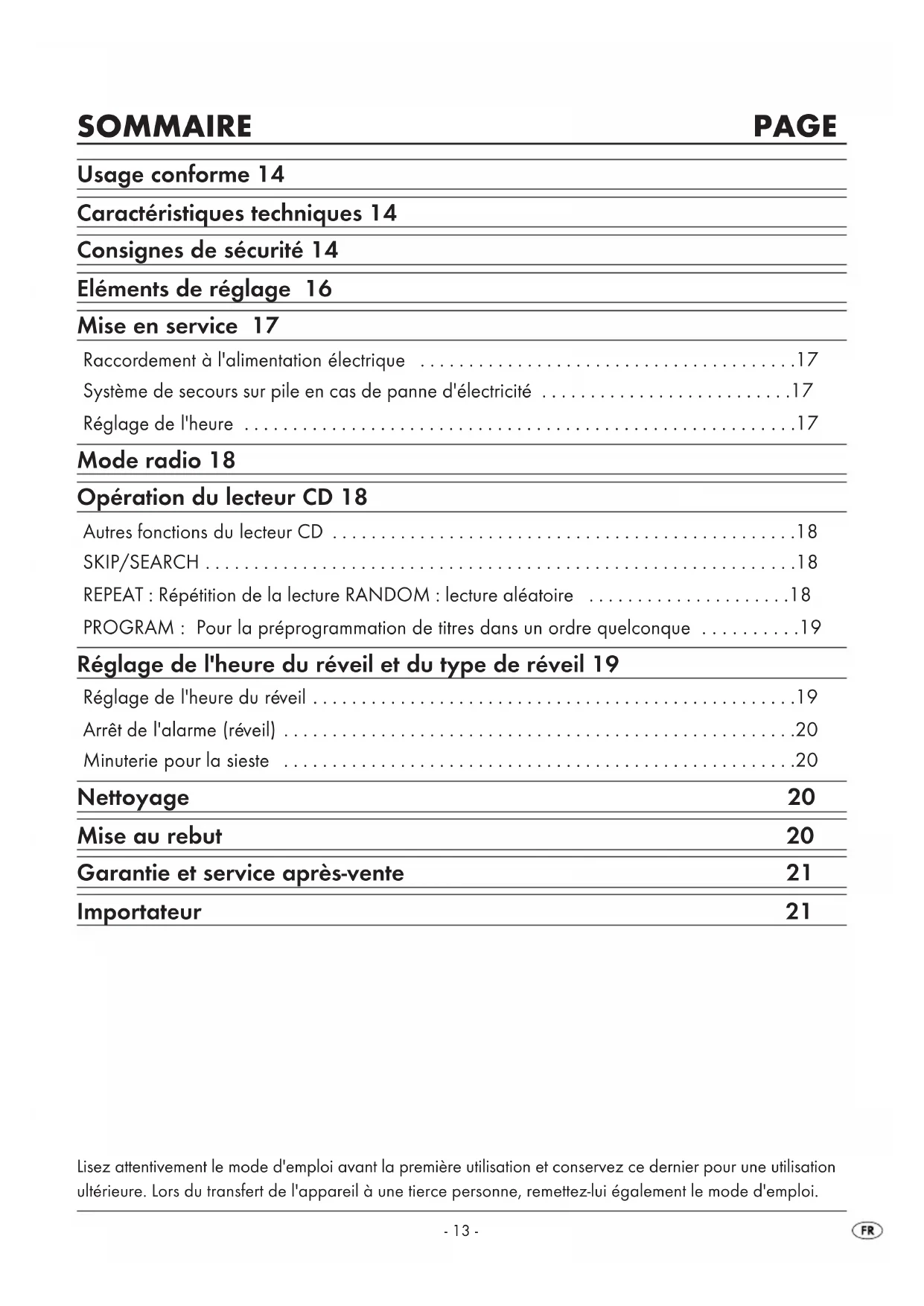 Cet apparéil est destiné à la réception des stations radio FM / AM. Il compte également une fonction réveil par sonnerie ou par radio. Cet apparéil est uniquement prévu pour un usage domestique. Il n'est pas prévu pour une utilisation commerciale ou industrielle.