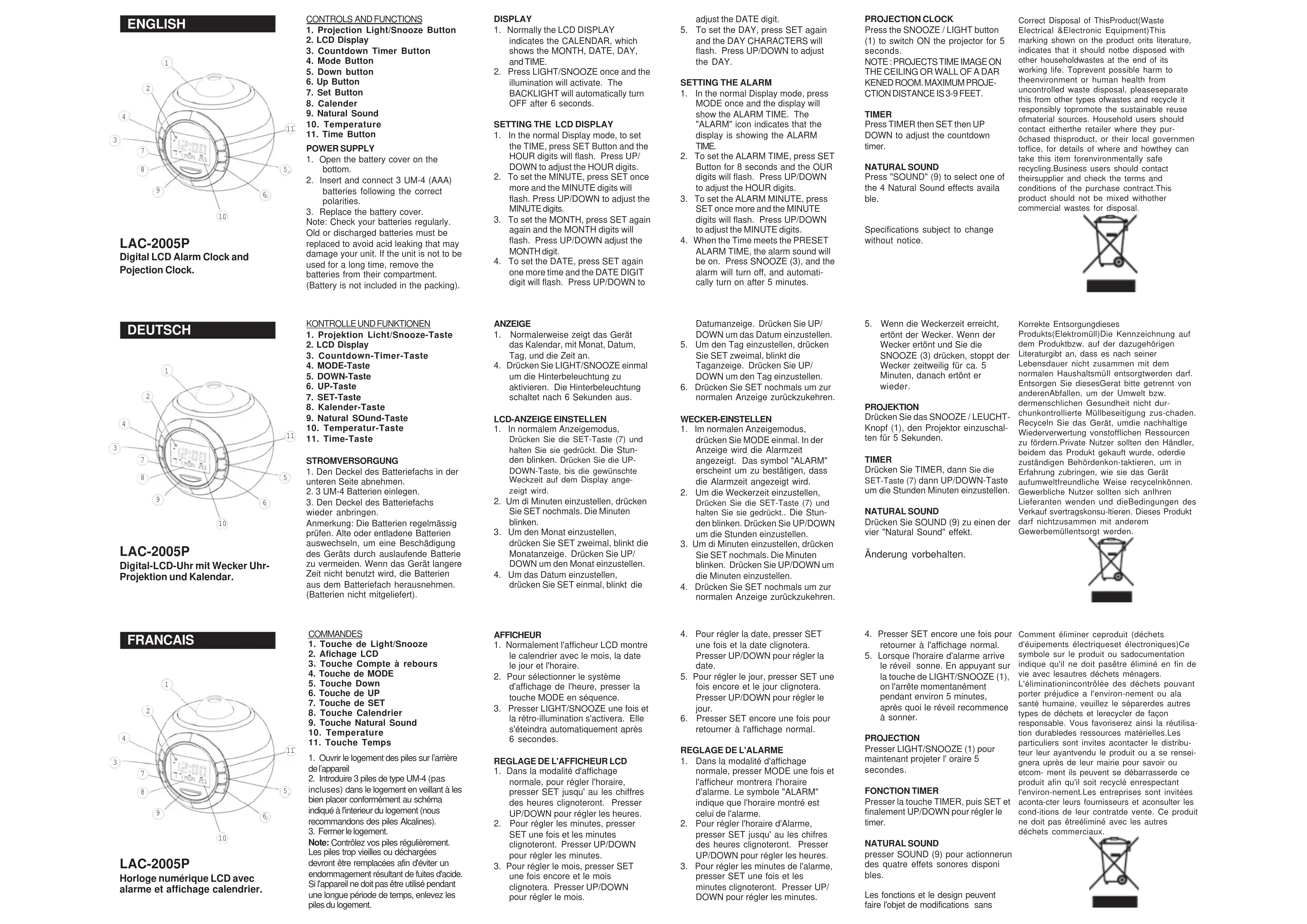 presser SET une fois et les minutes clignoteront. Presser UP/ DOWN pour régler les minutes. LAC-2005P Horloge numérique LCD avec alarme et affichage calendrier.