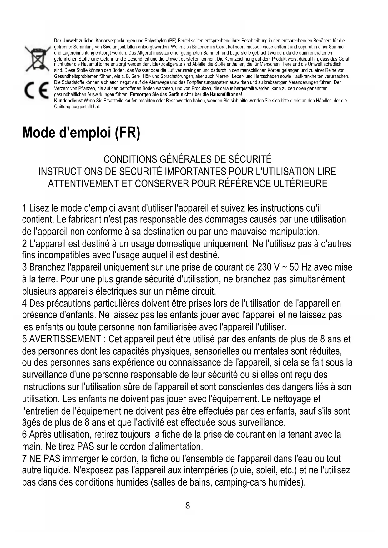 Der Umwelt zuliebe. Kartonverpackungen und Polyethylen (PE)-Beutel sollten entsprechend ihrer Beschreibung in den entsprechenden Behältern für die getrennte Sammlung von Siedlungsabfällen entsorgt werden. Wenn sich Batterien im Gerät befinden, müssen diese entfernt und separat in einer Sammel- und Lagereinrichtung entsorgt werden. Das Altgerät muss zu einer geeigneten Sammel- und Lagerstelle gebracht werden, da die darin enthaltenen gefährlichen Stoffe eine Gefahr für die Gesundheit und die Umwelt darstellen können. Die Kennzeichnung auf dem Produkt weist darauf hin, dass das Gerät nicht über die Hausmülltonne entsorgt werden darf. Elektroaltgeräte sind Abfälle, die Stoffe enthalten, die für Menschen, Tiere und die Umwelt schädlich sind. Diese Stoffe können den Boden, das Wasser oder die Luft verunreinigen und dadurch in den menschlichen Körper gelangen und zu einer Reihe von Gesundheitsproblemen führen, wie z. B. Seh-, Hör- und Sprachstörungen, aber auch Nieren-, Leber- und Herzschäden sowie Hautkrankheiten verursachen. Die Schadstoffe können sich auch negativ auf die Atemwege und das Fortpflanzungssystem auswirken und zu krebsartigen Veränderungen führen. Der Verzehr von Pflanzen, die auf den betroffenen Böden wachsen, und von Produkten, die daraus hergestellt werden, kann zu den oben genannten gesundheitlichen Auswirkungen führen. Entsorgen Sie das Gerät nicht über die Hausmülltonne! Kundendienst Wenn Sie Ersatzteile kaufen möchten oder Beschwerden haben, wenden Sie sich bitte wenden Sie sich bitte direkt an den Händler, der die Quittung ausgestellt hat. Mode d'emploi (FR) CONDITIONS GÉNÉRALES DE SÉCURITÉ INSTRUCTIONS DE SÉCURITÉ IMPORTANTES POUR L'UTILISATION LIRE ATTENTIVEMENT ET CONSERVER POUR RÉFÉRENCE ULTÉRIEURE 1.Lisez le mode d'emploi avant d'utiliser l'appareil et suivez les instructions qu'il contient. Le fabricant n'est pas responsable des dommages causés par une utilisation de l'appareil non conforme à sa destination ou par une mauvaise manipulation. 2.L'appareil est destiné à un usage domestique uniquement. Ne l'utilisez pas à d'autres fins incompatibles avec l'usage auquel il est destiné. 3.Branchez l'appareil uniquement sur une prise de courant de 230 V ~ 50 Hz avec mise à la terre. Pour une plus grande sécurité d'utilisation, ne branchez pas simultanément plusieurs appareils électriques sur un même circuit. 4.Des précautions particulières doivent être prises lors de l'utilisation de l'appareil en présence d'enfants. Ne laissez pas les enfants jouer avec l'appareil et ne laissez pas les enfants ou toute personne non familiarisée avec l'appareil l'utiliser. 5.AVERTISSEMENT : Cet appareil peut être utilisé par des enfants de plus de 8 ans et des personnes dont les capacités physiques, sensorielles ou mentales sont réduites, ou des personnes sans expérience ou connaissance de l'appareil, si cela se fait sous la surveillance d'une personne responsable de leur sécurité ou si elles ont reçu des instructions sur l'utilisation sûre de l'appareil et sont conscientes des dangers liés à son utilisation. Les enfants ne doivent pas jouer avec l'équipement. Le nettoyage et l'entretien de l'équipement ne doivent pas être effectués par des enfants, sauf s'ils sont âgés de plus de 8 ans et que l'activité est effectuée sous surveillance. 6.Après utilisation, retirez toujours la fiche de la prise de courant en la tenant avec la main. Ne tirez PAS sur le cordon d'alimentation. 7.NE PAS immerger le cordon, la fiche ou l'ensemble de l'appareil dans l'eau ou tout autre liquide. N'exposez pas l'appareil aux intempéries (pluie, soleil, etc.) et ne l'utilisez pas dans des conditions humides (salles de bains, camping-cars humides).9 8.Vérifiez régulièrement l'état du cordon d'alimentation. Si le cordon d'alimentation est endommagé, il doit être remplacé par un réparateur spécialisé afin d'éviter tout danger. 9.N'utilisez pas l'appareil si le cordon d'alimentation est endommagé, s'il est tombé, s'il a été endommagé d'une autre manière ou s'il ne fonctionne pas correctement. Ne réparez pas l'appareil vous-même, car il y a un risque d'électrocution. Apportez l'appareil endommagé à un centre de service compétent pour qu'il soit inspecté ou réparé. Les réparations ne peuvent être effectuées que par des centres de service agréés. Une réparation incorrecte peut présenter un risque grave pour l'utilisateur. 10.Placez l'appareil sur une surface plane, stable et froide, à l'écart d'appareils de cuisson chauds tels qu'une cuisinière électrique, un brûleur à gaz, etc. 11.N'utilisez pas l'appareil à proximité de matériaux inflammables. 12.Le cordon d'alimentation ne doit pas pendre du bord de la table ni toucher des surfaces chaudes. 13.Ne laissez pas l'appareil ou le bloc d'alimentation branché sur la prise sans surveillance. 14.Pour une protection supplémentaire, il est conseillé d'installer dans le circuit électrique un dispositif à courant différentiel résiduel (DDR) dont le courant résiduel nominal ne dépasse pas 30 mA. Un électricien spécialisé doit être consulté à cet égard.