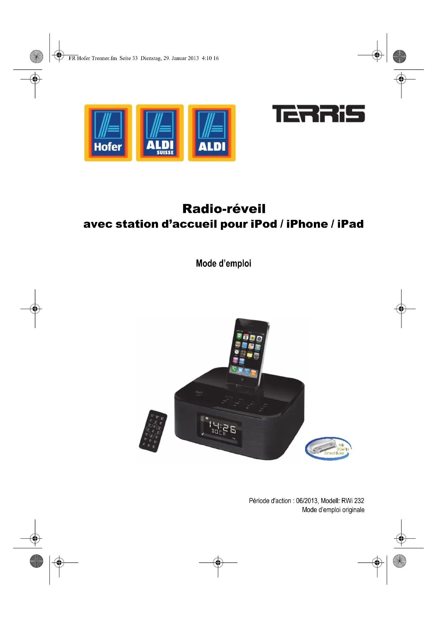 Name des Käufers: ......................................................................................... PLZ/Ort: ......................................................................................... Straße: ......................................................................................... Tel.Nr./E-mail: ......................................................................................... Unterschrift: ......................................................................................... _RWi_232_Hofer.book Seite 32 Montag, 28. Januar 2013 2:22 14Radio-réveil avec station d’accueil pour iPod / iPhone / iPad Mode d’emploi Période d'action : 06/2013, Modell: RWi 232 Mode d’emploi originale FR Hofer Trenner.fm Seite 33 Dienstag, 29. Januar 2013 4:10 1634 Nous vous remercions pour votre confiance ! Nous vous félicitons pour l'achat de votre nouveau radio-réveil Terris avec station d'accueil pour iPod/iPhone/iPad. Nous sommes convain- cus que vous serez satisfait de cet appareil moderne. Afin de garantir un fonctionnement optimal constant ainsi que l'effica- cité de votre radio-réveil et d'assurer votre sécurité personnelle : Lisez attentivement ce mode d'emploi avant la première utilisation et surtout, respectez les consignes de sécurité ! Nous vous souhaitons beaucoup de plaisir avec votre nouveau radio- réveil avec station d'accueil pour iPod/iPhone/iPad! Remarques relatives à la déclaration de conformité Par la présente, la société Globaltronics GmbH & Co. KG déclare que le présent produit est conforme aux exigences fondamen- tales et aux prescriptions applicables de la directive 1999/5/CE (Equipements hertziens et équipements terminaux de télécom- munication), de la directive 2004/108/CE (Compatibilité électro- magnétique), de la directive 2009/125/CE (Exigences en matière d'écoconception applicables aux produits liés à l'énergie) ainsi qu'à la directive 2006/95/CE (Basse tension). Vous trouverez la déclaration de conformité dans son intégralité sur Internet, à l'adresse www.gt-support.de. _RWi_232_Hofer.book Seite 34 Montag, 28. Januar 2013 2:22 1435 Eléments livrés Français Vue d'ensemble des données