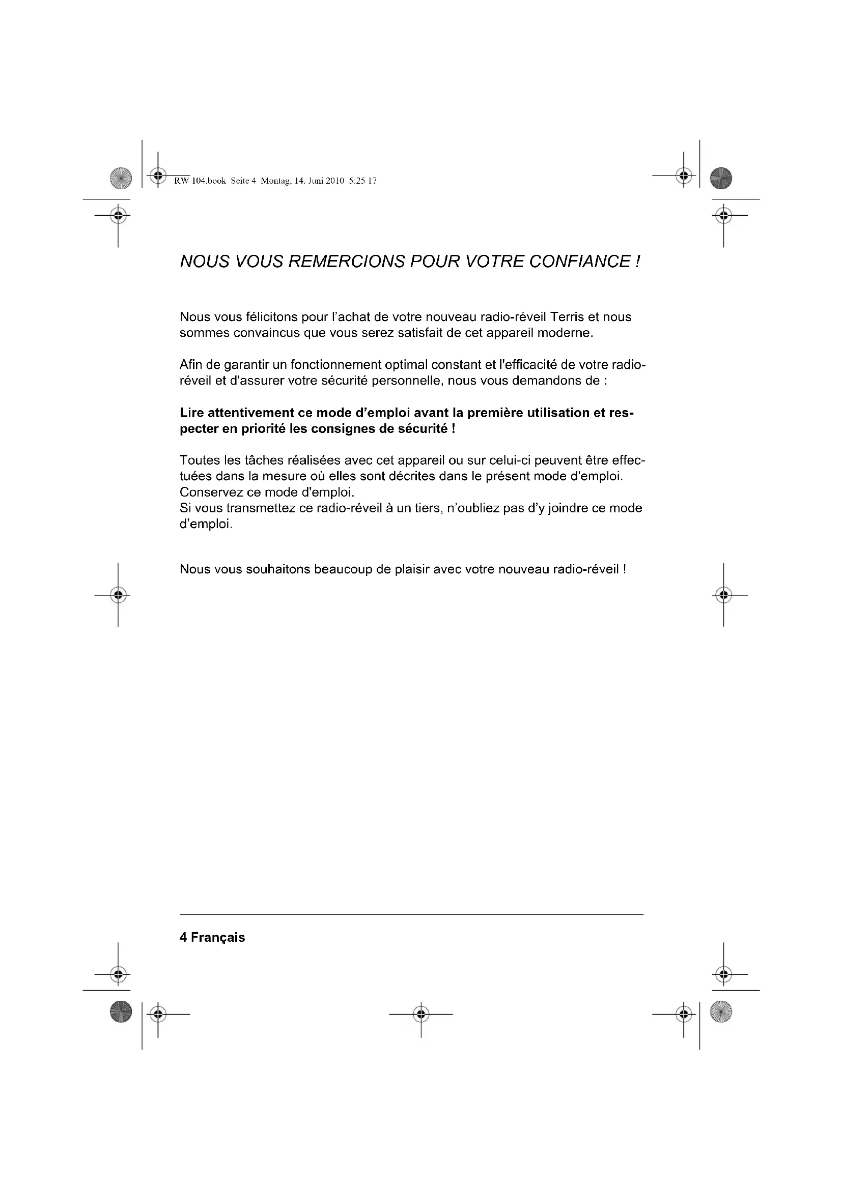 RW 104.book Seite 3 Montag, 14. Juni 2010 5:25 174 Français NOUS VOUS REMERCIONS POUR VOTRE CONFIANCE ! Nous vous félicitons pour l’achat de votre nouveau radio-réveil Terris et nous sommes convaincus que vous serez satisfait de cet appareil moderne. Afin de garantir un fonctionnement optimal constant et l'efficacité de votre radio- réveil et d'assurer votre sécurité personnelle, nous vous demandons de : Lire attentivement ce mode d’emploi avant la première utilisation et res- pecter en priorité les consignes de sécurité ! Toutes les tâches réalisées avec cet appareil ou sur celui-ci peuvent être effec- tuées dans la mesure où elles sont décrites dans le présent mode d'emploi. Conservez ce mode d'emploi. Si vous transmettez ce radio-réveil à un tiers, n’oubliez pas d’y joindre ce mode d’emploi. Nous vous souhaitons beaucoup de plaisir avec votre nouveau radio-réveil ! RW 104.book Seite 4 Montag, 14. Juni 2010 5:25 17Français 5