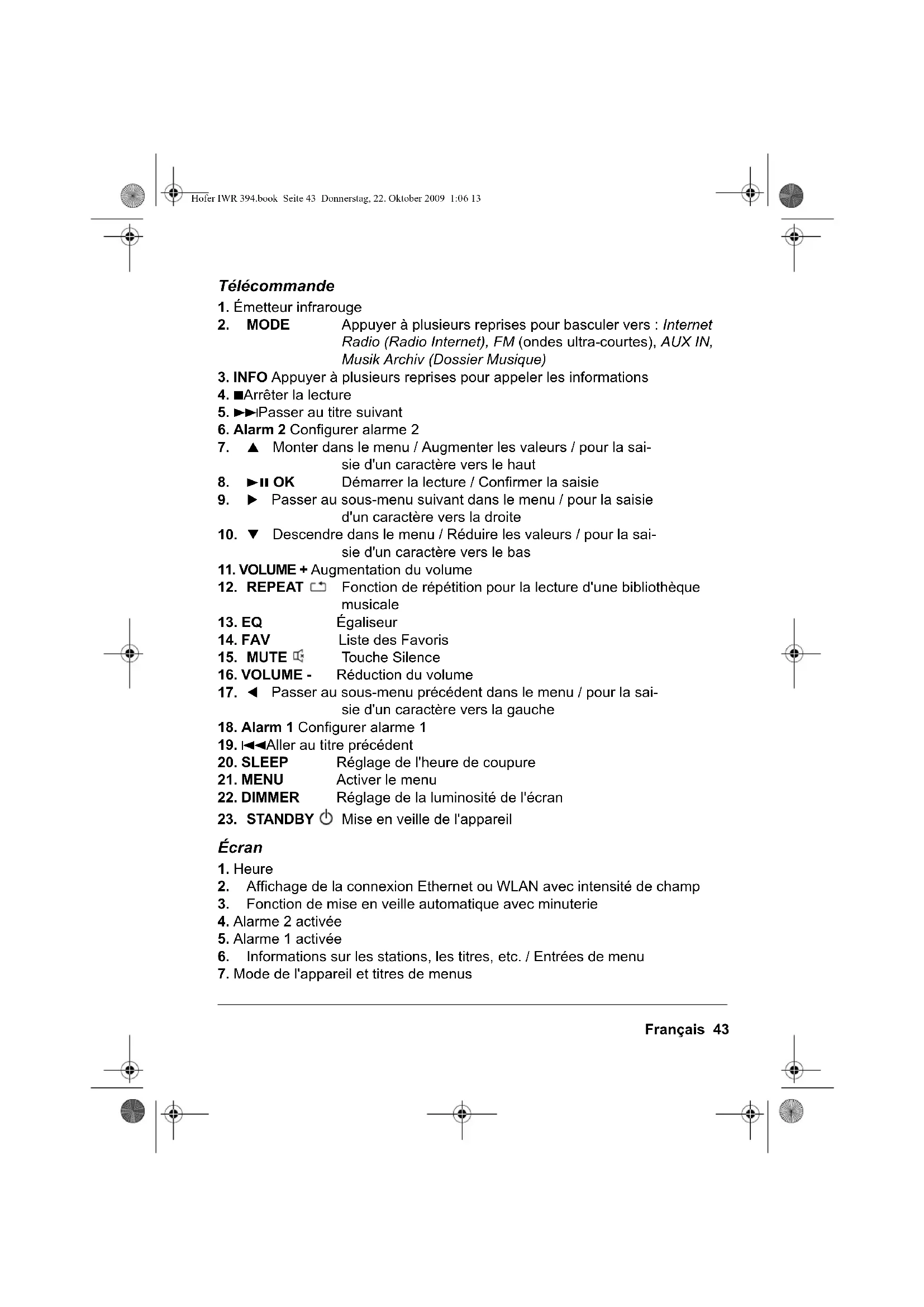 Hofer IWR 394.book Seite 38 Donnerstag, 22. Oktober 2009 1:06 13Français 39 NOUS VOUS REMERCIONS DE VOTRE CONFIANCE ! Nous vous félicitons pour l'achat de votre nouveau radio-réveil Internet Tevion et nous sommes convaincus que vous serez satisfait de cet appareil moderne. Afin de garantir un fonctionnement optimal constant et l'efficacité de votre radio- réveil Internet et d'assurer votre sécurité personnelle, nous vous demandons de : Lire attentivement ce mode d'emploi avant la première utilisation et respec- ter en priorité les consignes de sécurité ! Toutes les tâches réalisées avec cet appareil ou sur celui-ci peuvent être effec- tuées dans la mesure où elles sont décrites dans le présent mode d'emploi. Conservez ce mode d'emploi. Si vous transmettez le radio-réveil Internet à un tiers, n'oubliez pas d'y joindre ce mode d'emploi. Nous vous souhaitons beaucoup de plaisir avec votre nouveau radio-réveil In- ternet ! Hofer IWR 394.book Seite 39 Donnerstag, 22. Oktober 2009 1:06 1340 Français