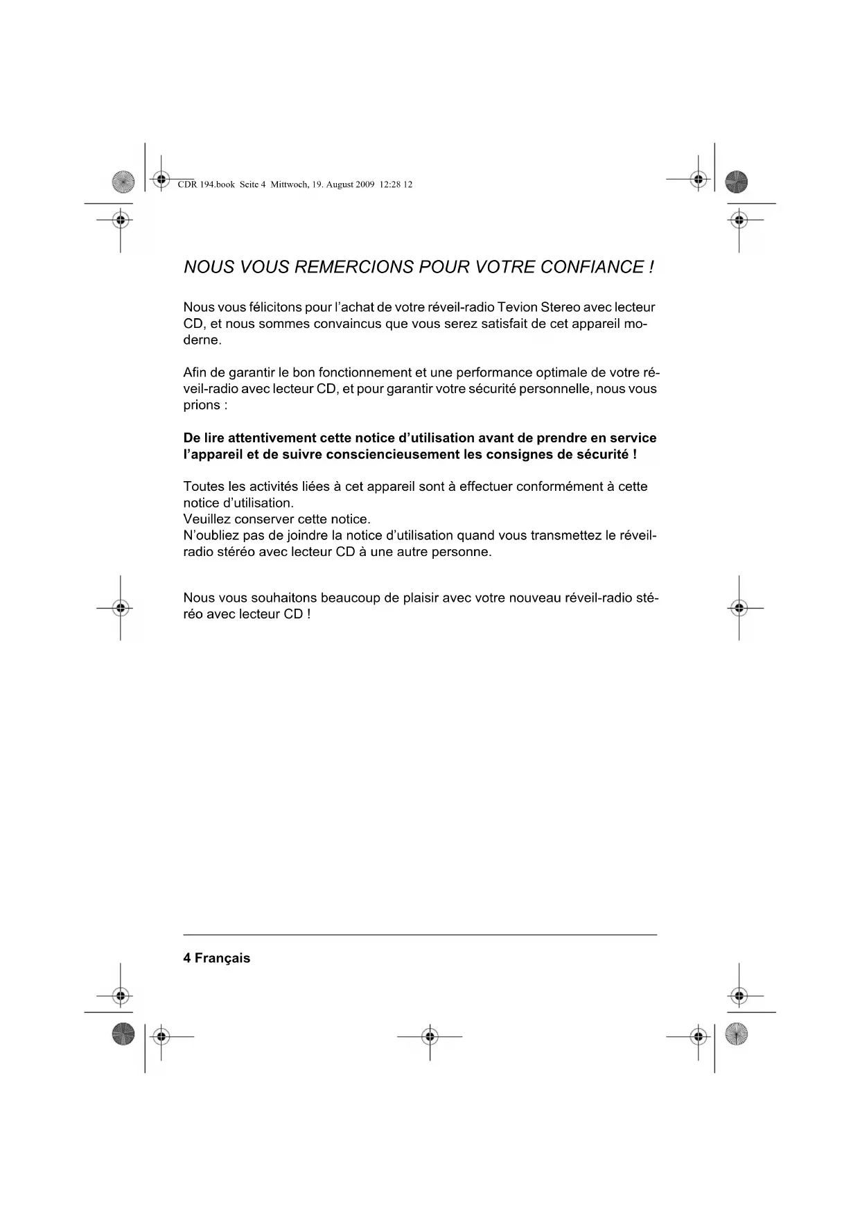 CDR 194.book Seite 3 Mittwoch, 19. August 2009 12:28 124 Français NOUS VOUS REMERCIONS POUR VOTRE CONFIANCE ! Nous vous félicitons pour l’achat de votre réveil-radio Tevion Stereo avec lecteur CD, et nous sommes convaincus que vous serez satisfait de cet appareil mo- derne. Afin de garantir le bon fonctionnement et une performance optimale de votre ré- veil-radio avec lecteur CD, et pour garantir votre sécurité personnelle, nous vous prions : De lire attentivement cette notice d’utilisation avant de prendre en service l’appareil et de suivre consciencieusement les consignes de sécurité ! Toutes les activités liées à cet appareil sont à effectuer conformément à cette notice d’utilisation. Veuillez conserver cette notice. N’oubliez pas de joindre la notice d’utilisation quand vous transmettez le réveil- radio stéréo avec lecteur CD à une autre personne. Nous vous souhaitons beaucoup de plaisir avec votre nouveau réveil-radio sté- réo avec lecteur CD ! CDR 194.book Seite 4 Mittwoch, 19. August 2009 12:28 12Français 5