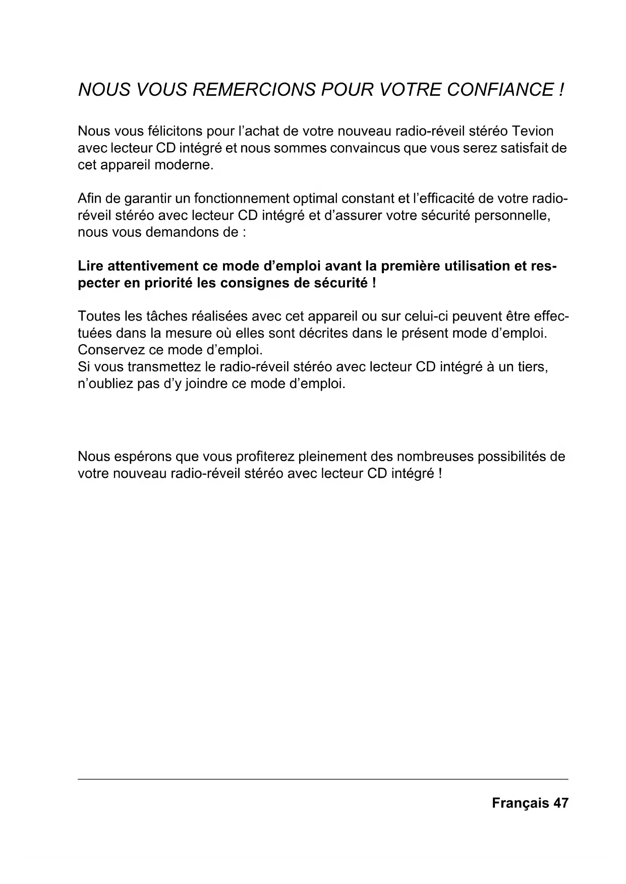 CDR 2009.book Seite 46 Donnerstag, 25. September 2008 3:46 15Français 47 NOUS VOUS REMERCIONS POUR VOTRE CONFIANCE ! Nous vous félicitons pour l’achat de votre nouveau radio-réveil stéréo Tevion avec lecteur CD intégré et nous sommes convaincus que vous serez satisfait de cet appareil moderne. Afin de garantir un fonctionnement optimal constant et l’efficacité de votre radio- réveil stéréo avec lecteur CD intégré et d’assurer votre sécurité personnelle, nous vous demandons de : Lire attentivement ce mode d’emploi avant la première utilisation et res- pecter en priorité les consignes de sécurité ! Toutes les tâches réalisées avec cet appareil ou sur celui-ci peuvent être effec- tuées dans la mesure où elles sont décrites dans le présent mode d’emploi. Conservez ce mode d’emploi. Si vous transmettez le radio-réveil stéréo avec lecteur CD intégré à un tiers, n’oubliez pas d’y joindre ce mode d’emploi. Nous espérons que vous profiterez pleinement des nombreuses possibilités de votre nouveau radio-réveil stéréo avec lecteur CD intégré ! CDR 2009.book Seite 47 Donnerstag, 25. September 2008 3:46 1548 Français