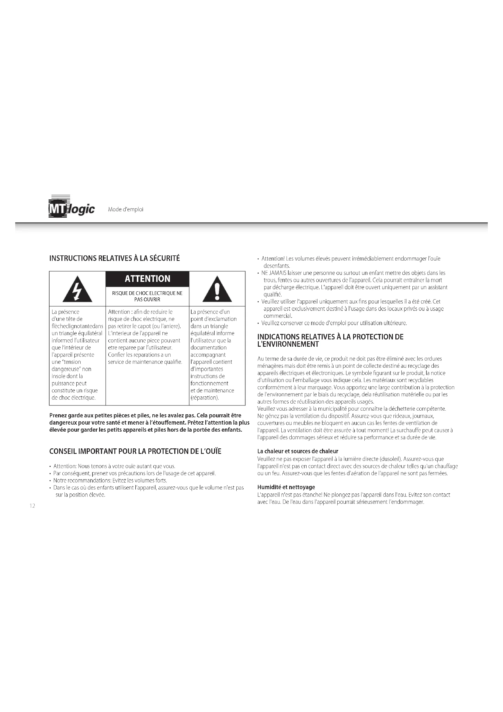 Attention! Les volumes élevés peuvent être émetiédablement endommager l'ouï des'enfants.