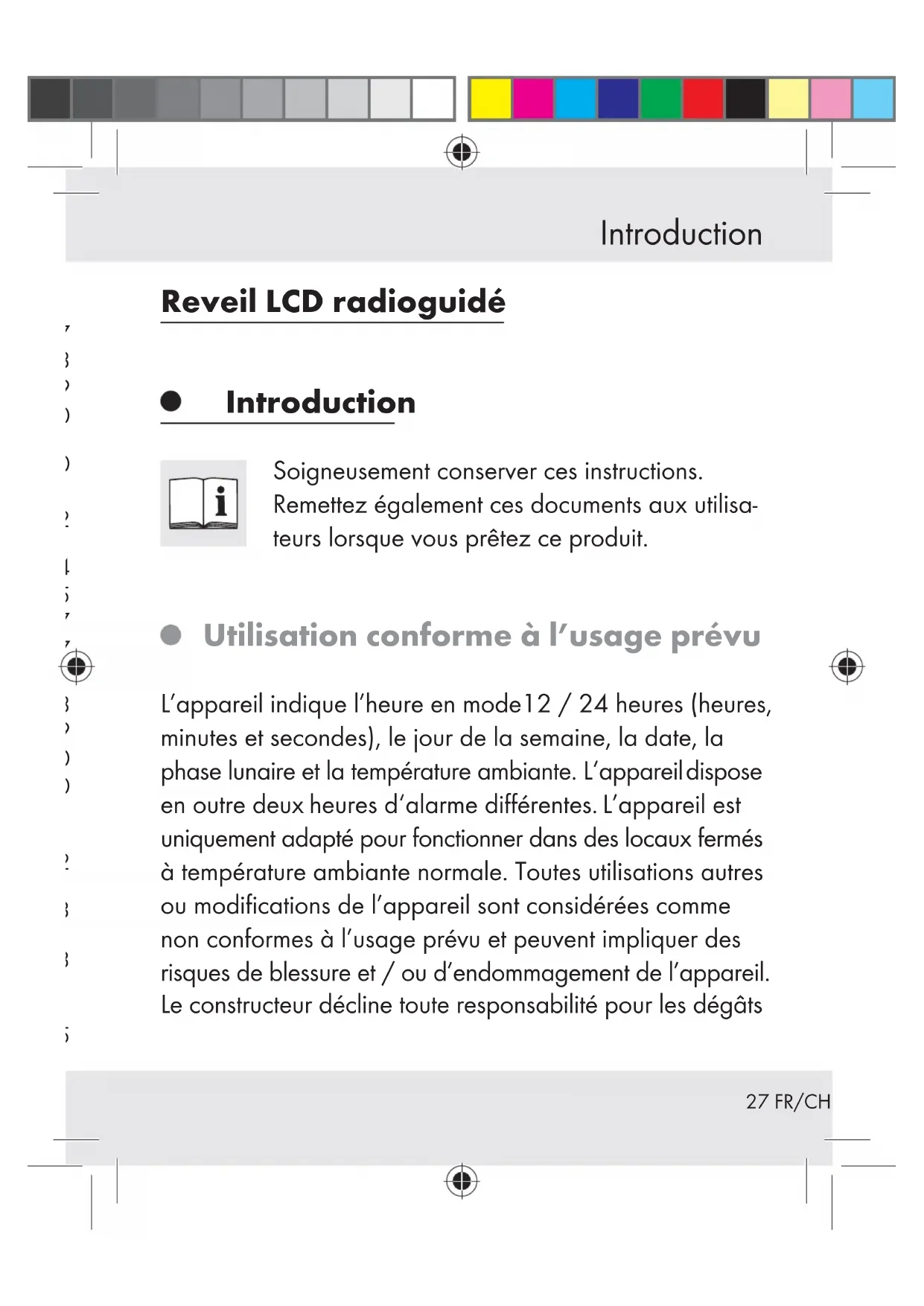 Introduction Reveil LCD radioguidé Introduction Soigneusement conserver ces instructions. Remettez également ces documents aux utilisa- teurs lorsque vous prêtez ce produit.